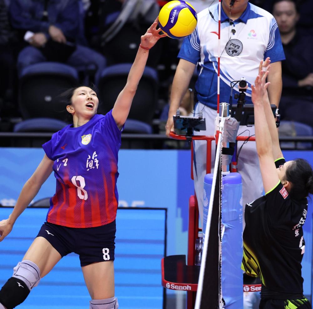 11月18日,江苏队球员张常宁(左)在比赛中进攻。新华社记者 陈斌 摄