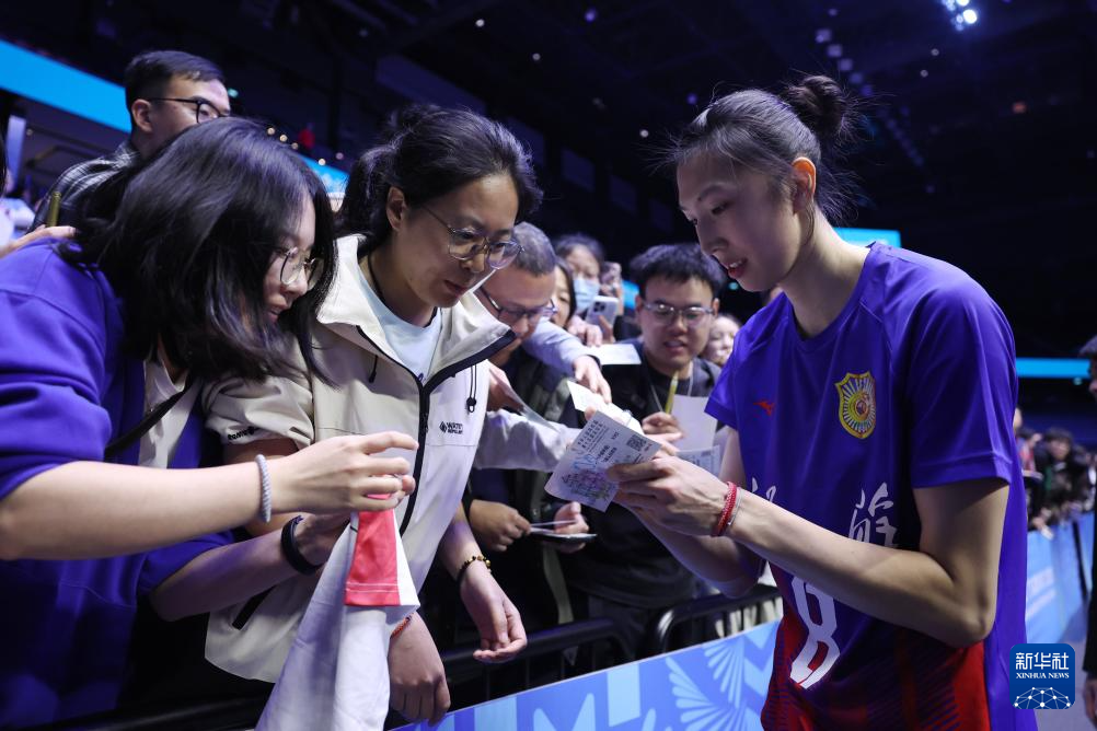 11月18日,江苏队球员吴梦洁(右一)赛后与球迷互动。