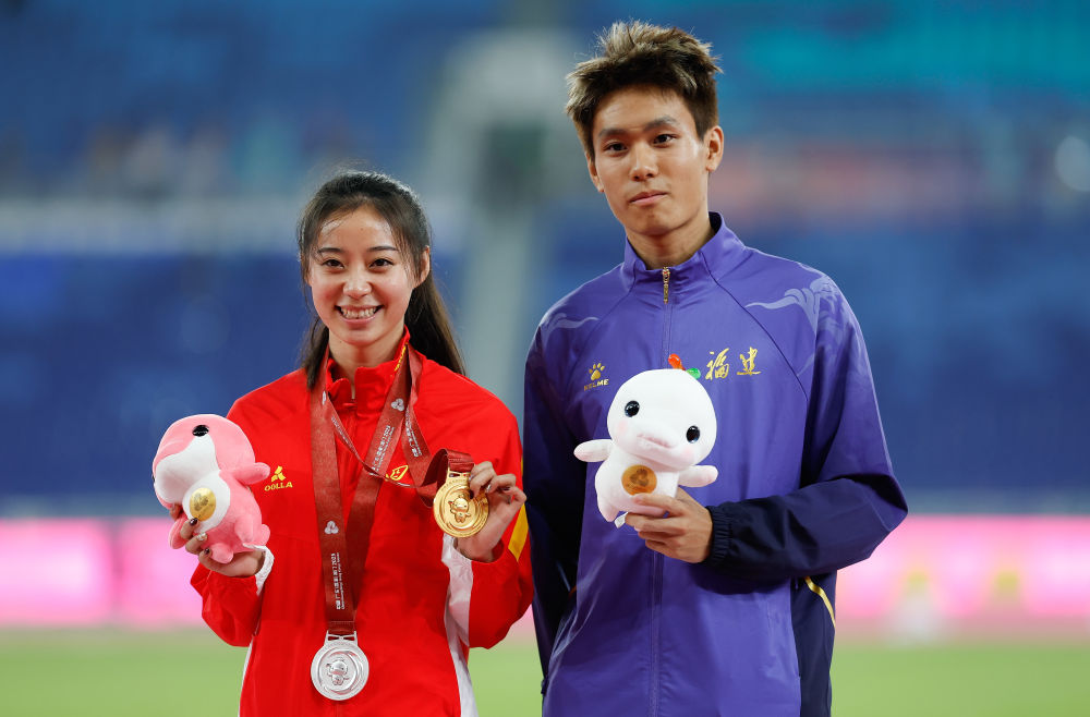 11月16日,冠军福建队选手何锦櫶(右)与四川队选手刘峡君在颁奖仪式上合影。当日,第十五届全国运动会田径4X100米混合接力颁奖仪式在广州举行。新华社记者 黄伟 摄