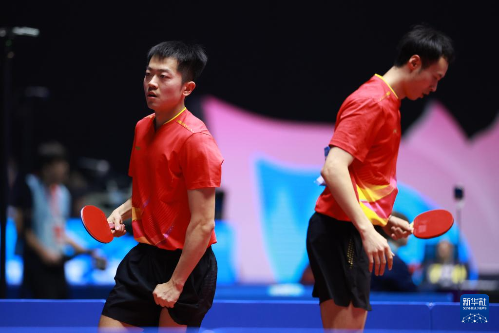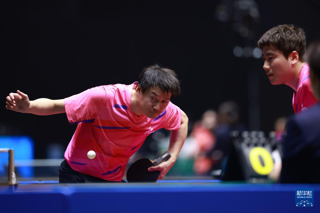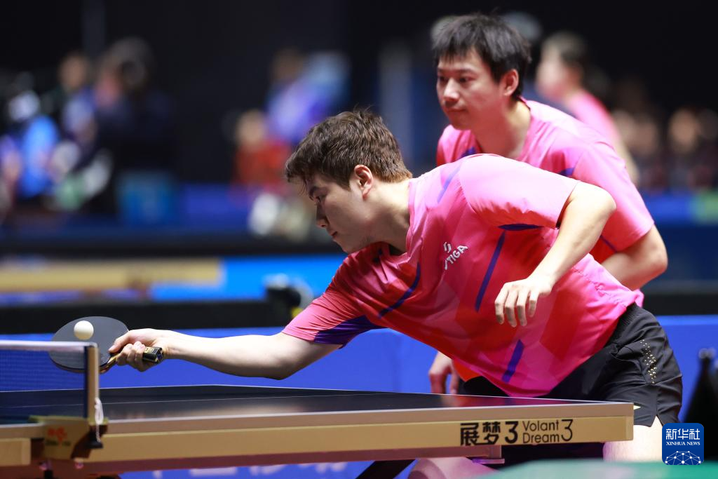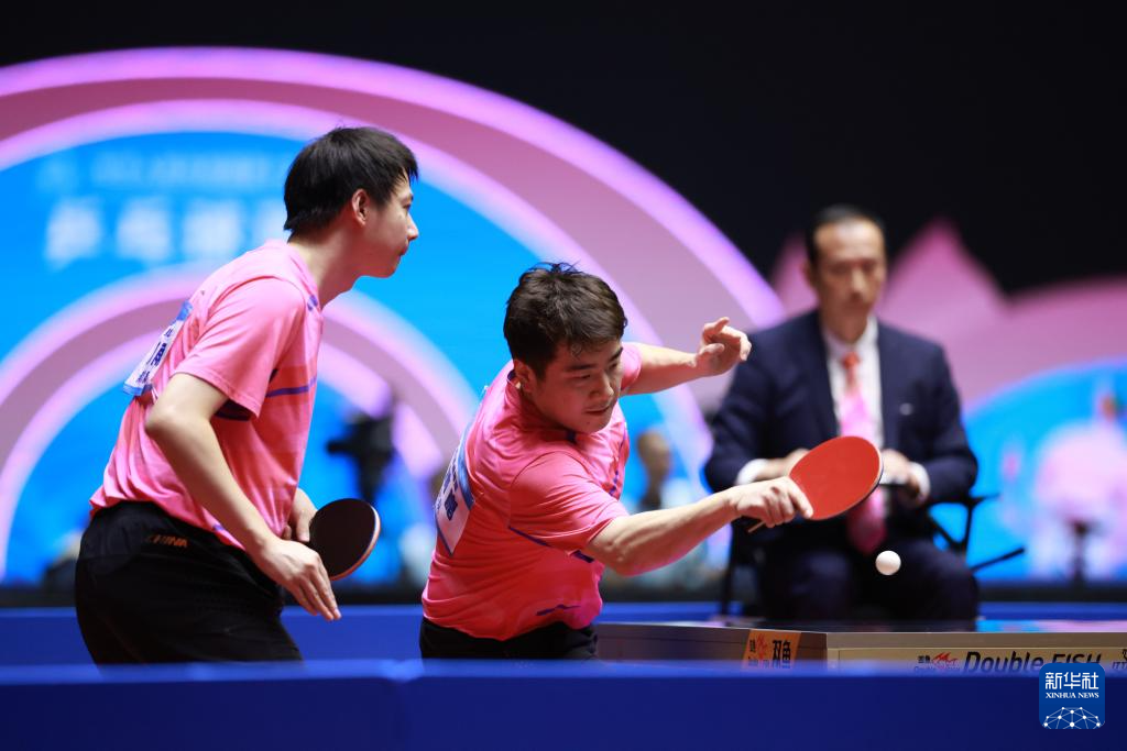 11月17日,河北队组合周雨/梁靖崑(右)在比赛中回球,他们3比2战胜辽宁队组合袁励岑/徐海东。