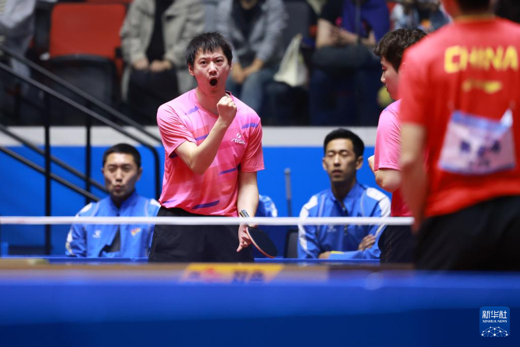 11月17日,河北队组合周雨(左)/梁靖崑在比赛中庆祝得分,他们3比2战胜辽宁队组合袁励岑/徐海东。