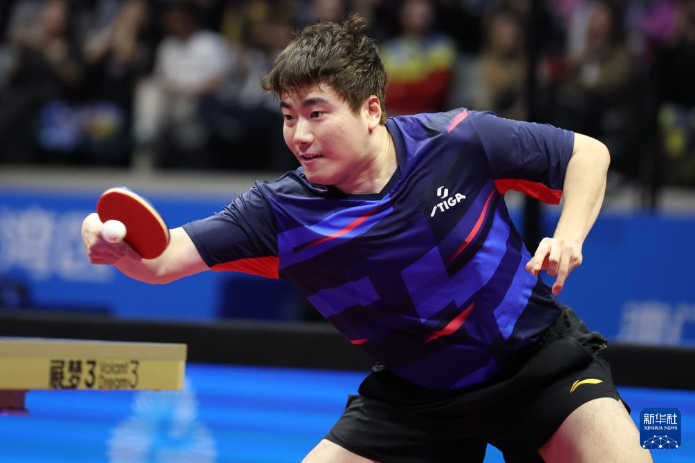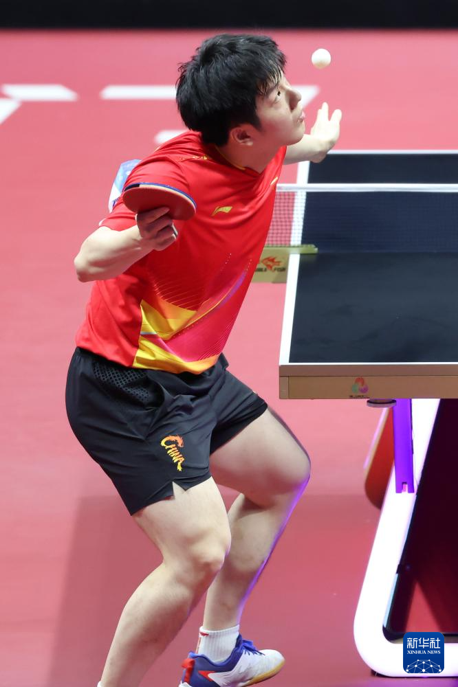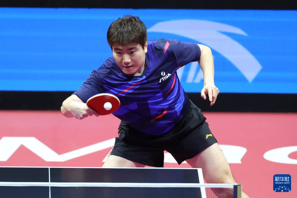 11月18日,河北队选手梁靖崑在比赛中回球。他2比3不敌上海队选手樊振东。