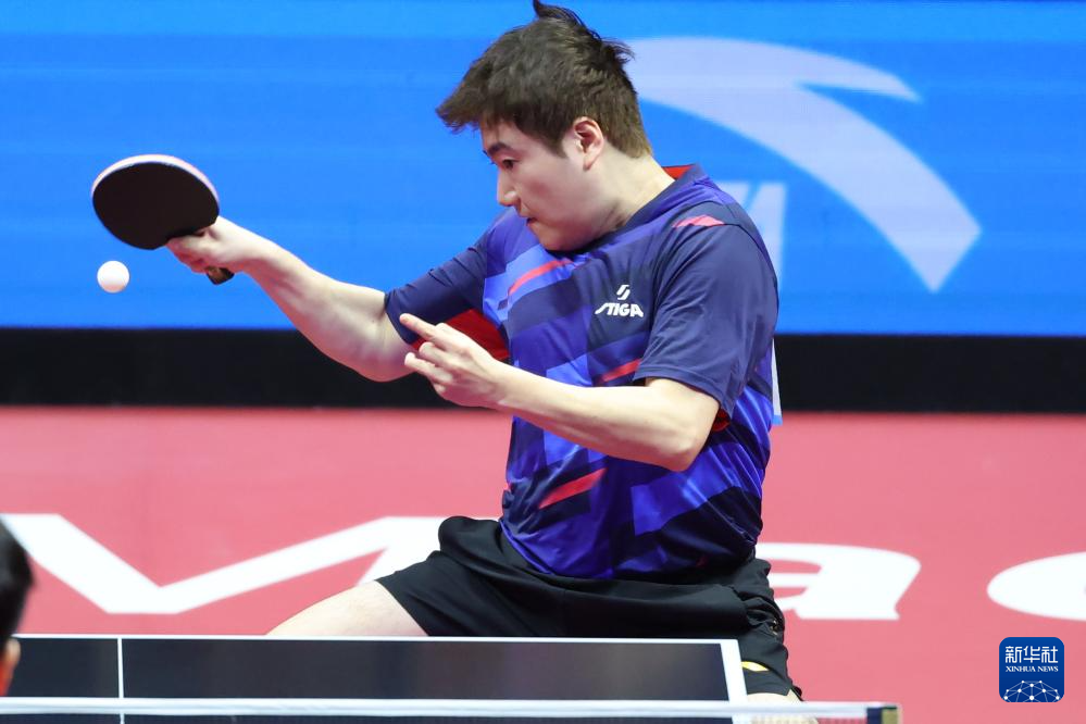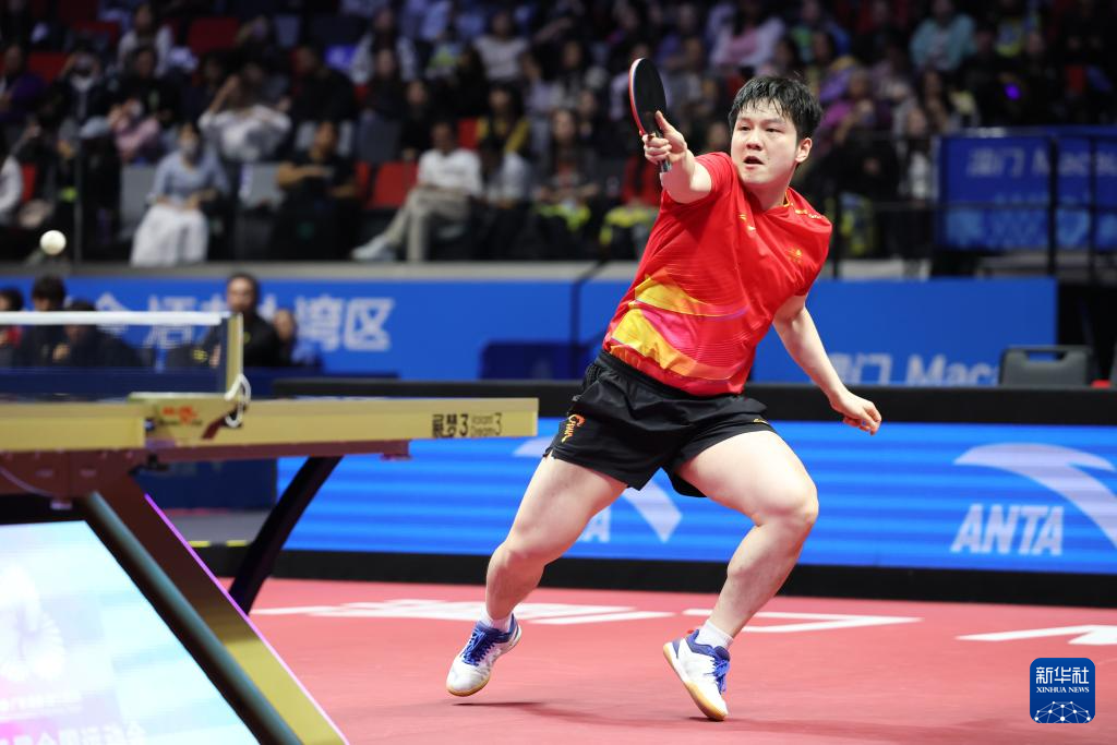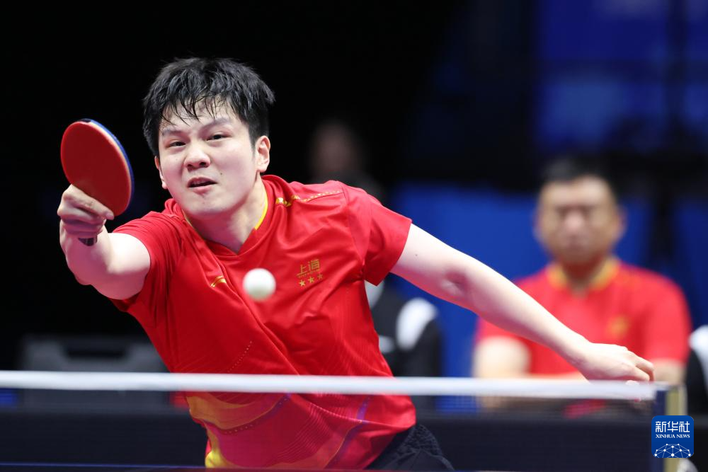 11月18日,上海队选手樊振东在比赛中回球。他3比2战胜河北队选手梁靖崑。