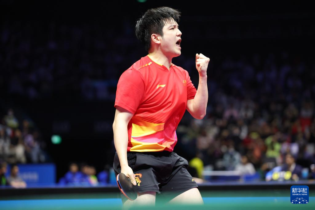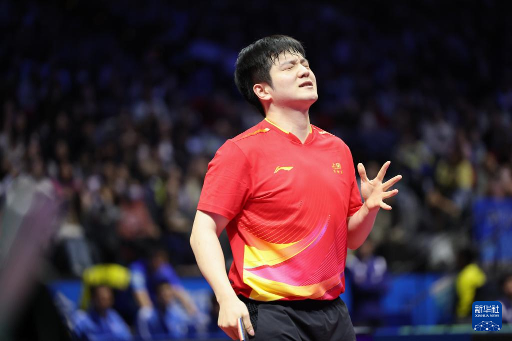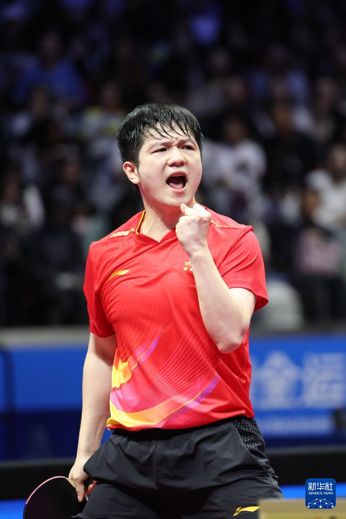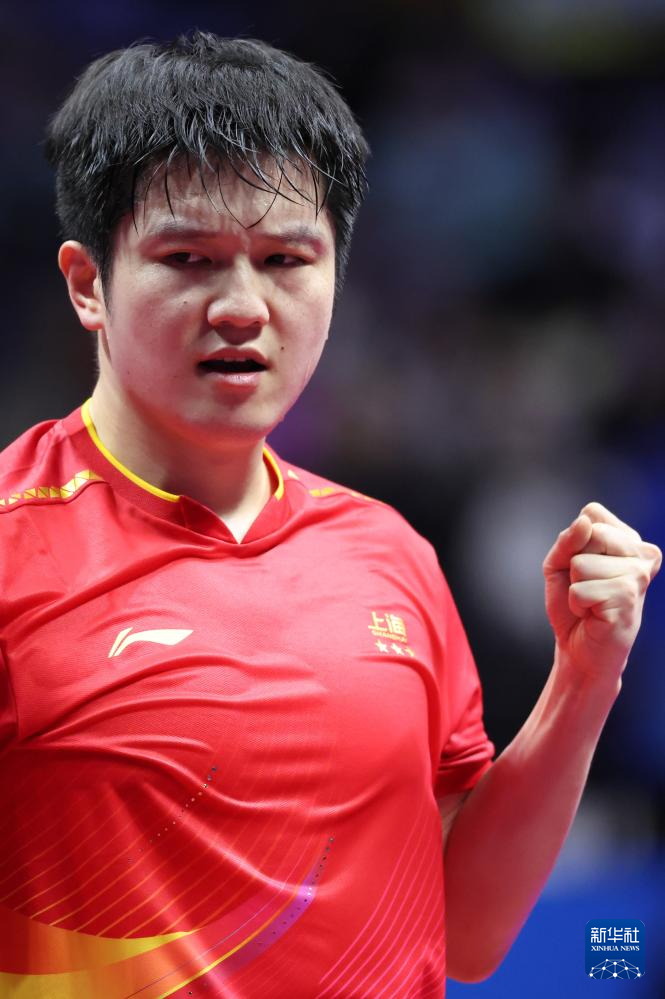 11月18日,上海队选手樊振东在比赛中庆祝。他3比2战胜河北队选手梁靖崑。