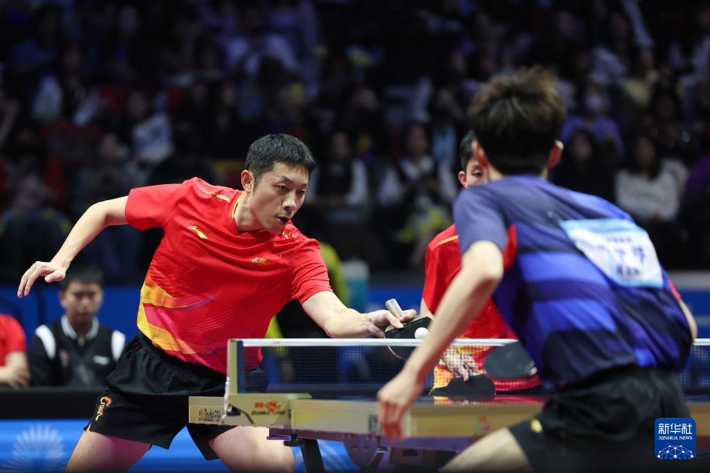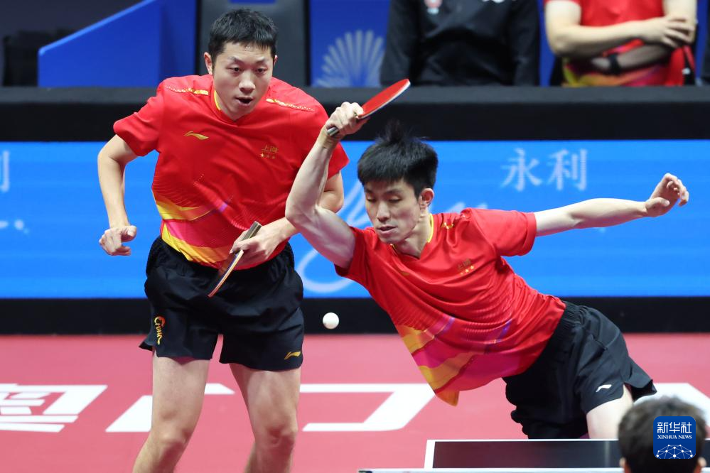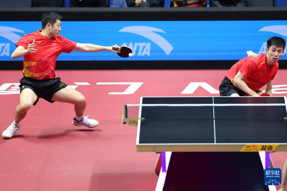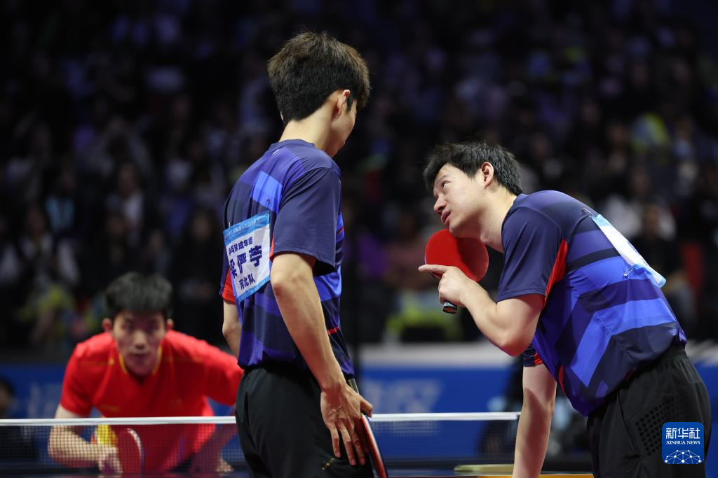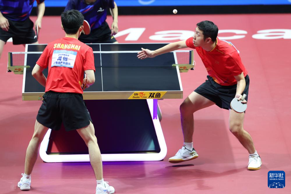 11月18日,上海队组合许昕(左)/周恺在比赛中,他们在双打比赛中3比1战胜河北队组合周雨/梁俨苧。