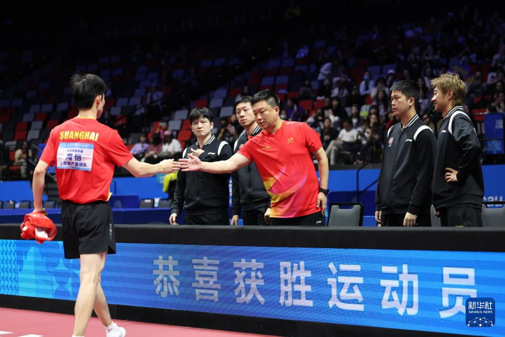 11月18日,上海队选手周恺(左一)在比赛后与教练击掌,他在单打比赛中3比1战胜河北队选手梁俨苧。