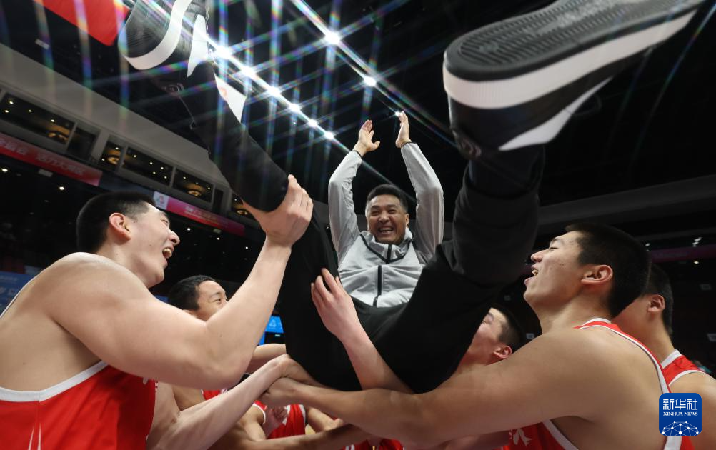 11月18日,广东队球员在比赛后将主教练原园(上)抛起庆祝夺冠。