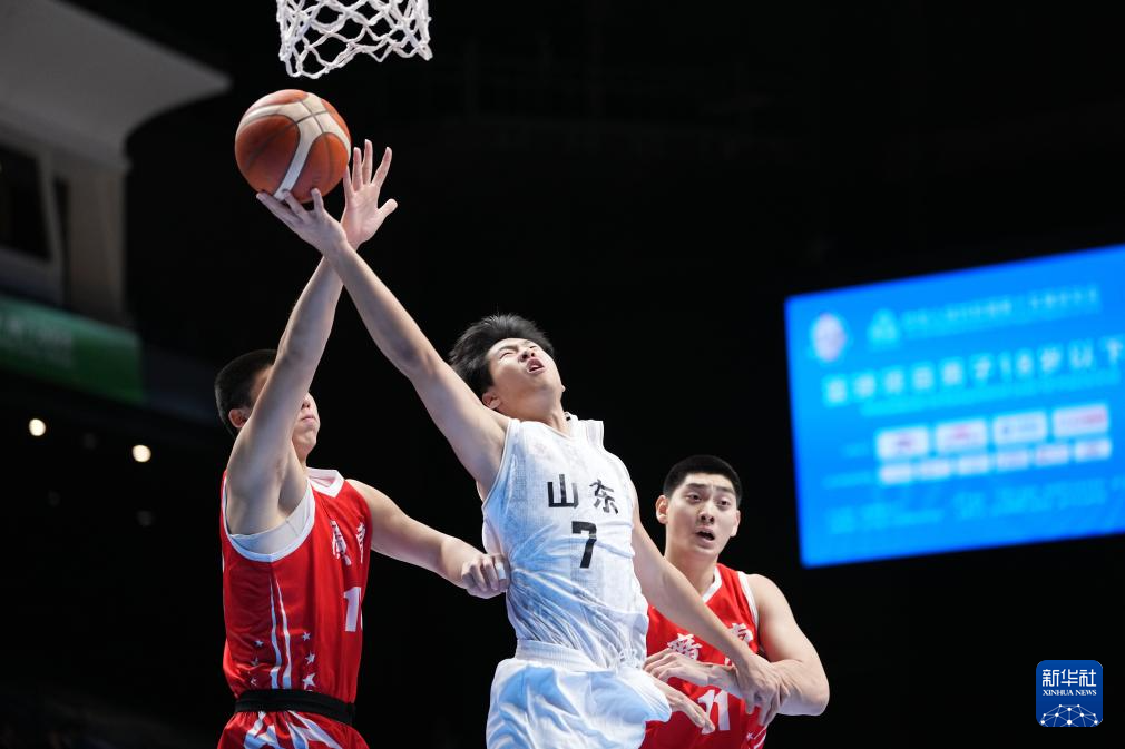 11月18日,山东队球员姚柯宇(中)在广东队球员吴铠博(左)、冯熙瑞的防守下进攻。