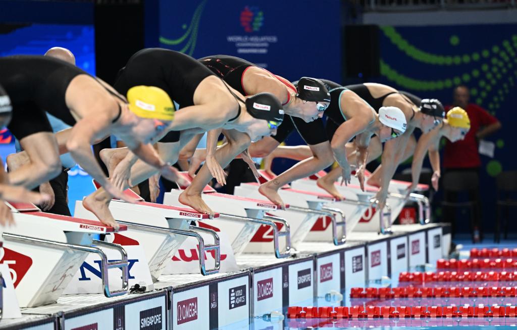 8月2日,世界游泳锦标赛游泳女子50米蝶泳决赛,选手们在比赛中出发。新华社记者 薛宇舸 摄