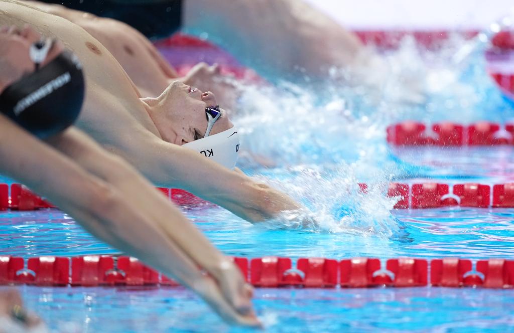 8月2日,世界游泳锦标赛游泳男子50米仰泳半决赛,匈牙利选手科斯(中)在比赛中出发。新华社记者 薛宇舸 摄