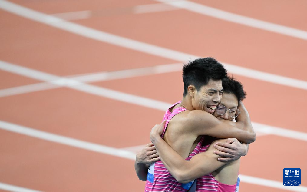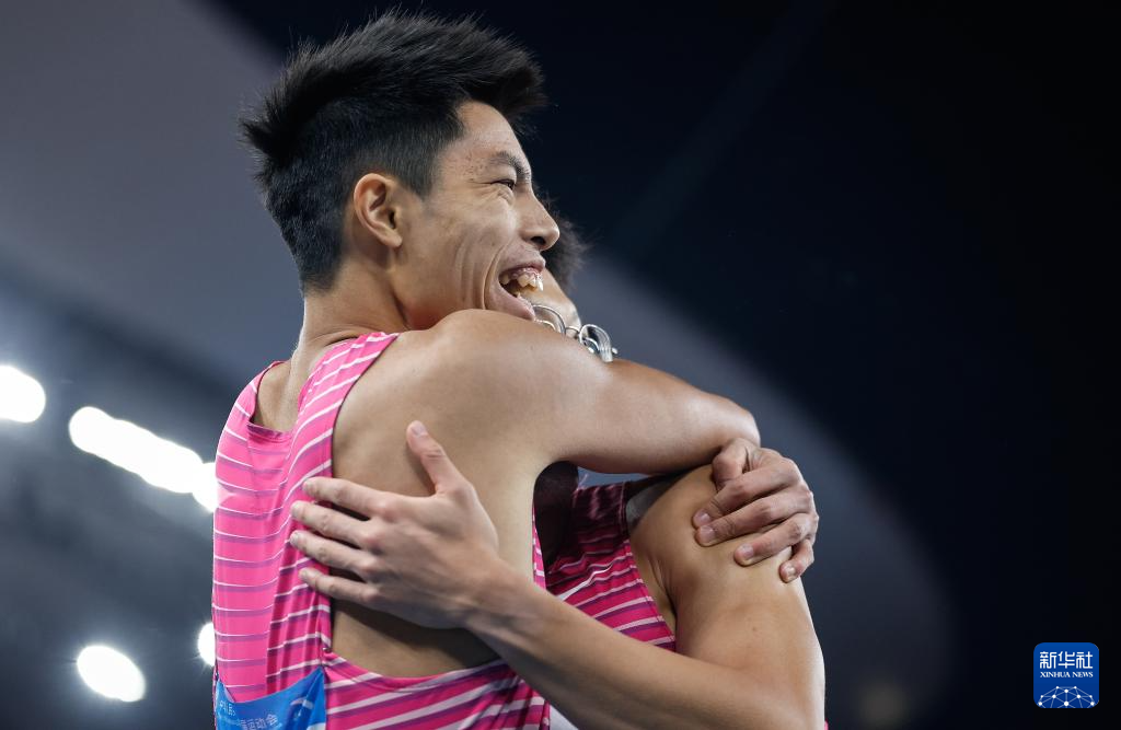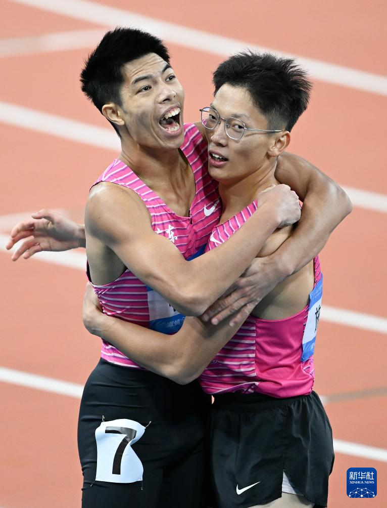 11月19日,广东队选手施君豪(右)和队友林健豪在比赛后拥抱庆祝。他们分别获得冠、亚军。