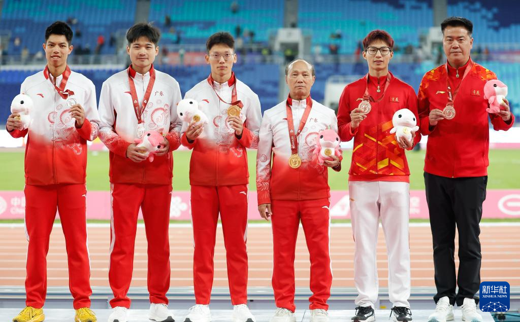 11月19日,获得冠军的广东队选手施君豪(左三)、获得亚军的广东队选手林健豪(左一)、获得季军的重庆队选手官鑫(右二)在颁奖仪式上与教练合影。