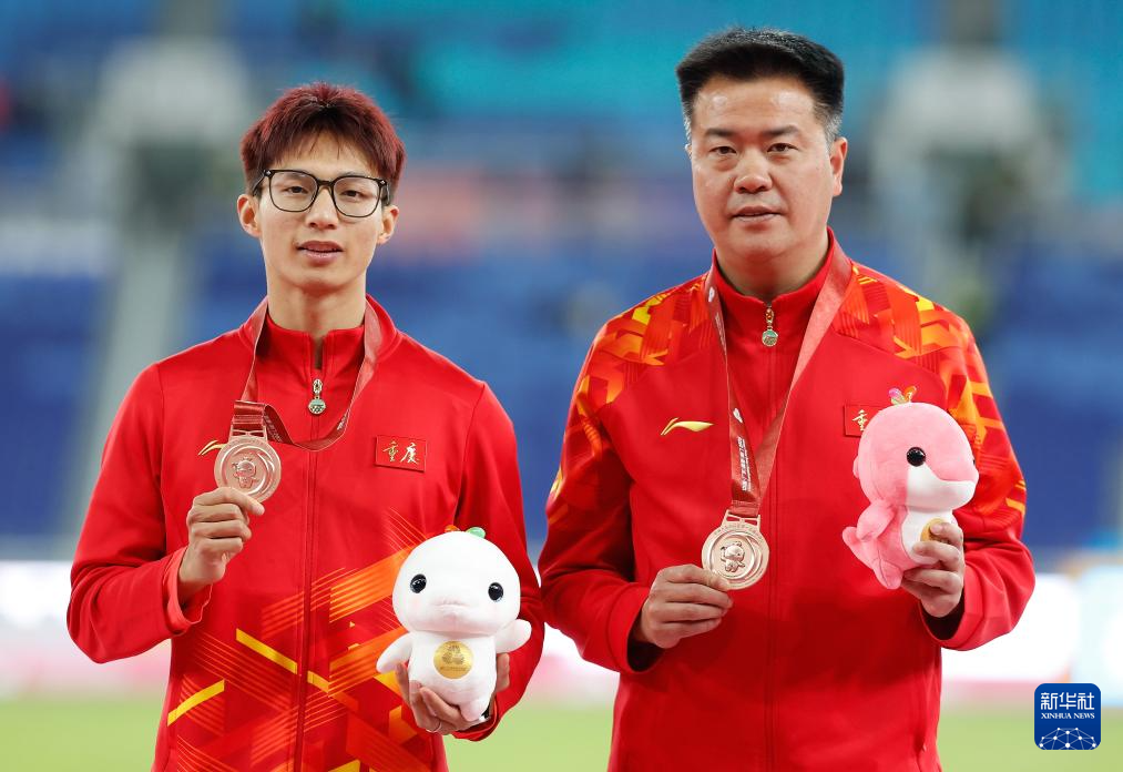 11月19日,获得季军的重庆队选手官鑫(左)和教练在颁奖仪式上。