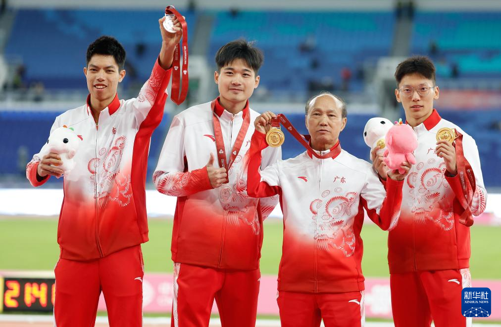 11月19日,获得冠军的广东队选手施君豪(右一)和获得亚军的队友林健豪(左一)在颁奖仪式上与教练合影。