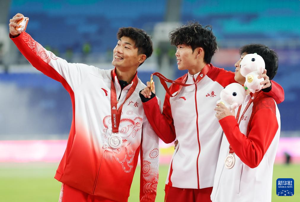 11月19日,获得冠军的山东队选手李晨洋(中)、获得亚军的广东队选手黄博凯(左)、获得季军的安徽队选手钟涛在颁奖仪式上自拍合影。