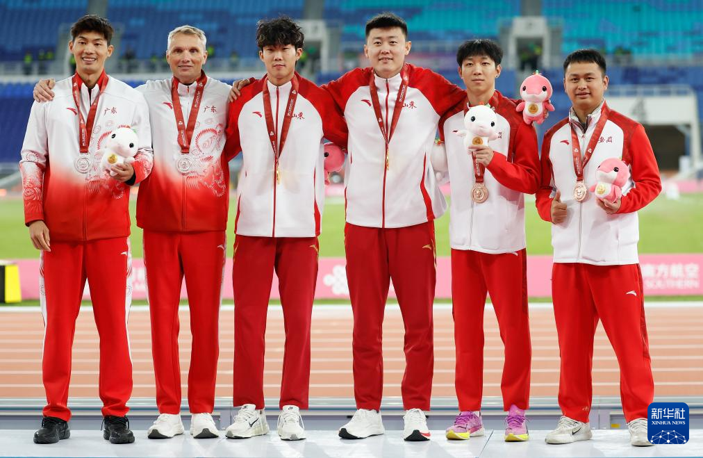 11月19日,获得冠军的山东队选手李晨洋(左三)、获得亚军的广东队选手黄博凯(左一)、获得季军的安徽队选手钟涛(右二)在颁奖仪式上与教练合影。