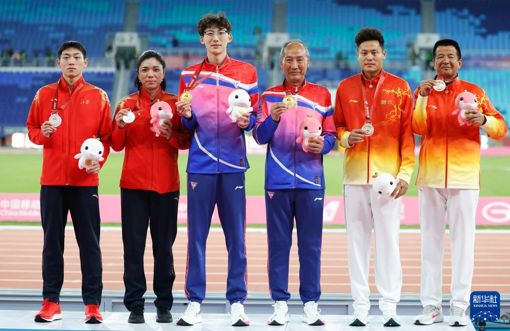 11月19日,获得冠军的上海队选手徐卓一(左三)、获得亚军的江苏队选手刘俊茜(左一)、获得季军的湖北队选手朱胜龙(右二)在颁奖仪式上与教练合影。