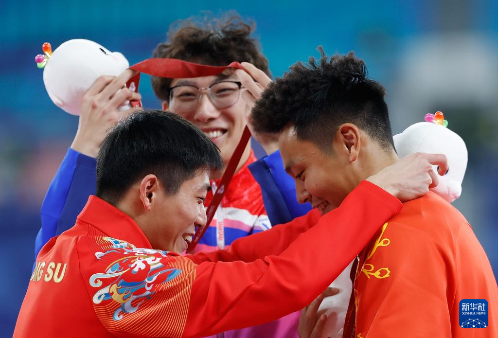 11月19日,获得冠军的上海队选手徐卓一(中)、获得亚军的江苏队选手刘俊茜(左)、获得季军的湖北队选手朱胜龙在颁奖仪式上互动。