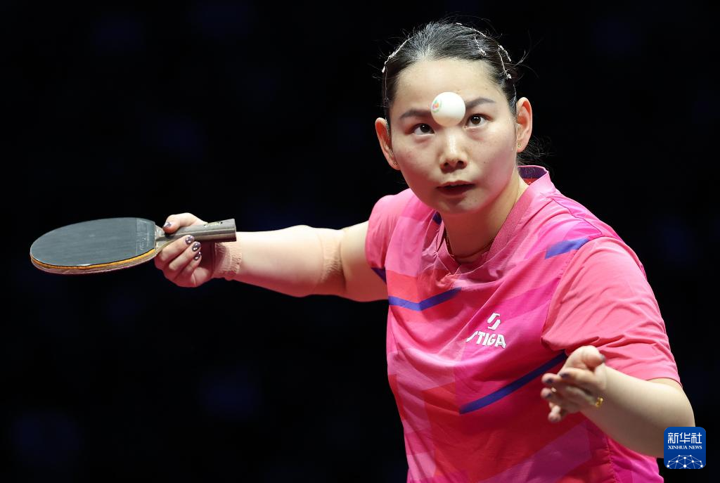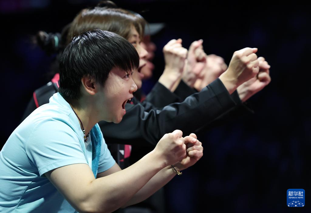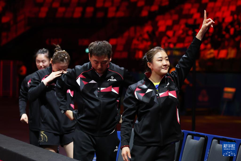 11月19日,河北队选手何卓佳(前右)在女单比赛中与团队沟通。