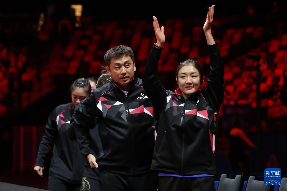 11月19日,冠军山东队成员陈梦(右)和亚军河北队成员孙颖莎在颁奖仪式上相互致意。