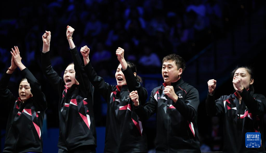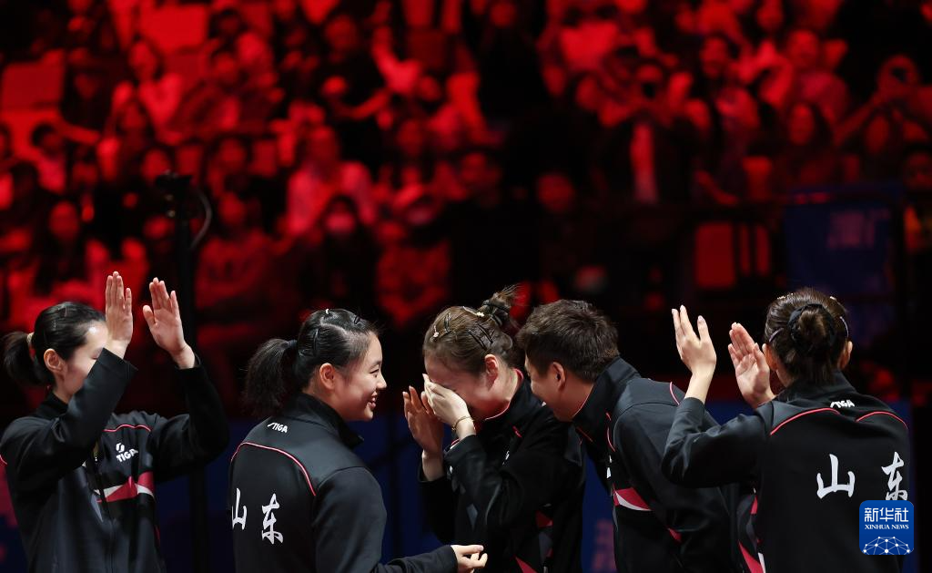 11月19日,山东队选手范思琦(左二)和队友陈梦(左三)庆祝夺冠。范思琦在女单比赛中3比2战胜河北队选手何卓佳。