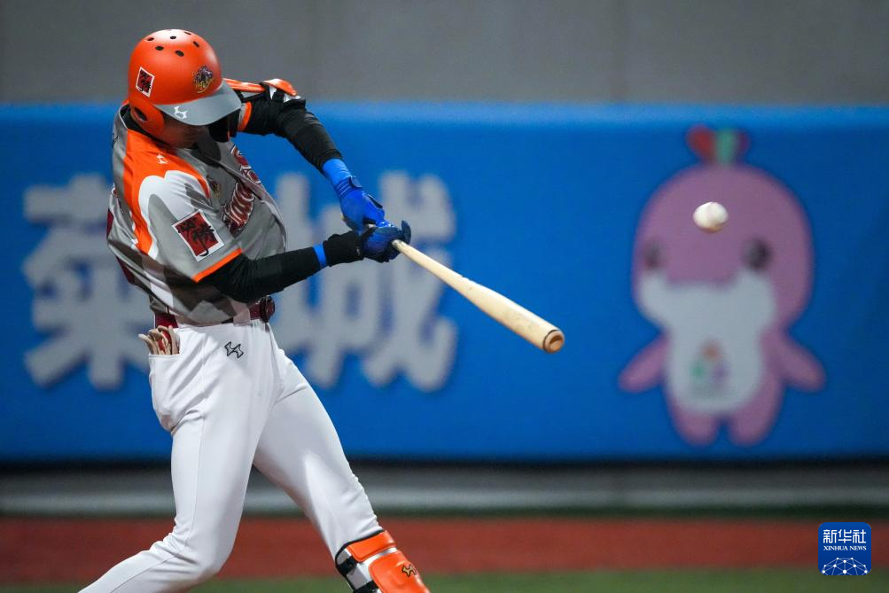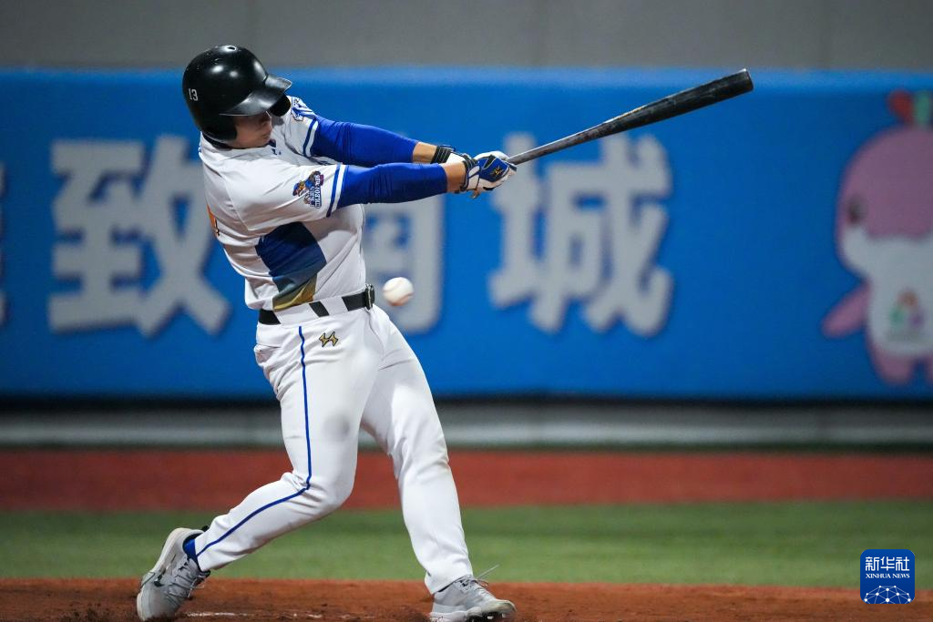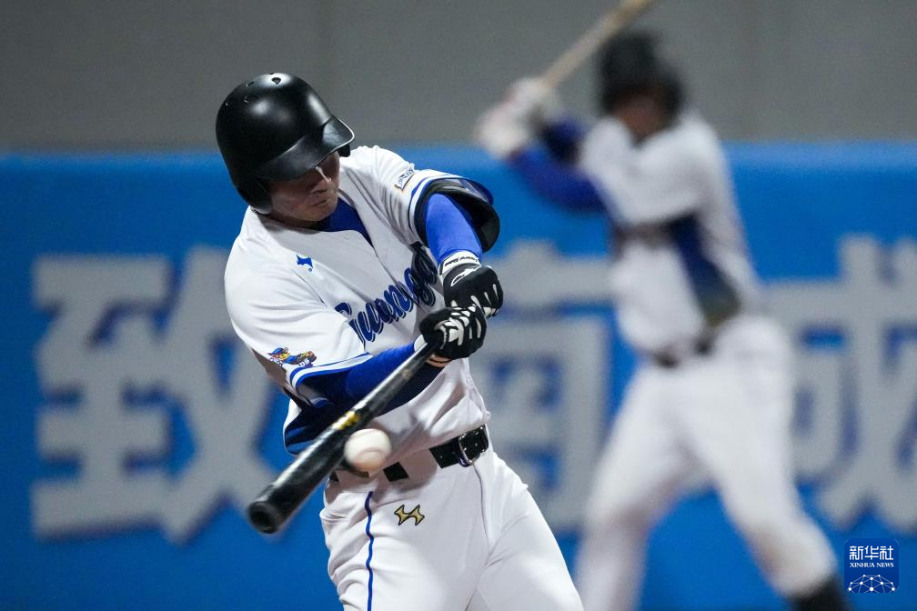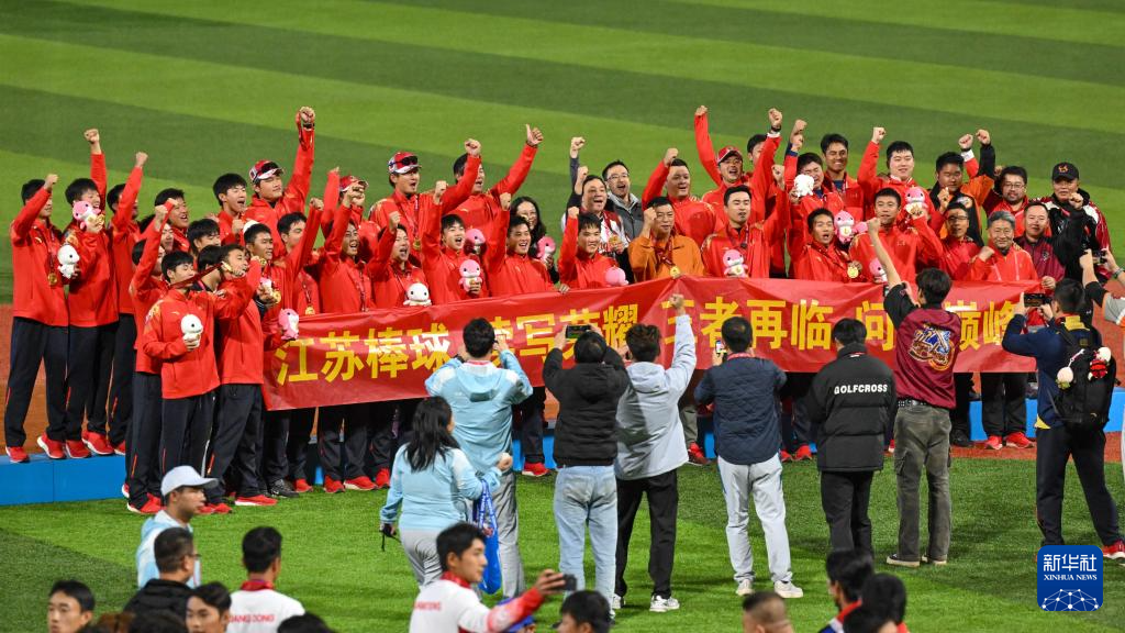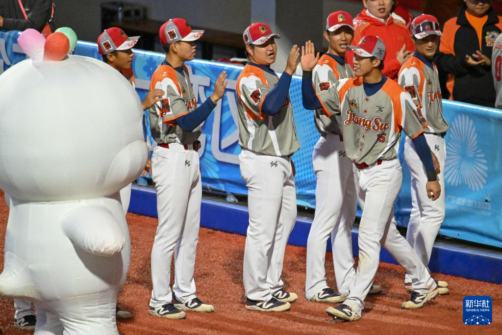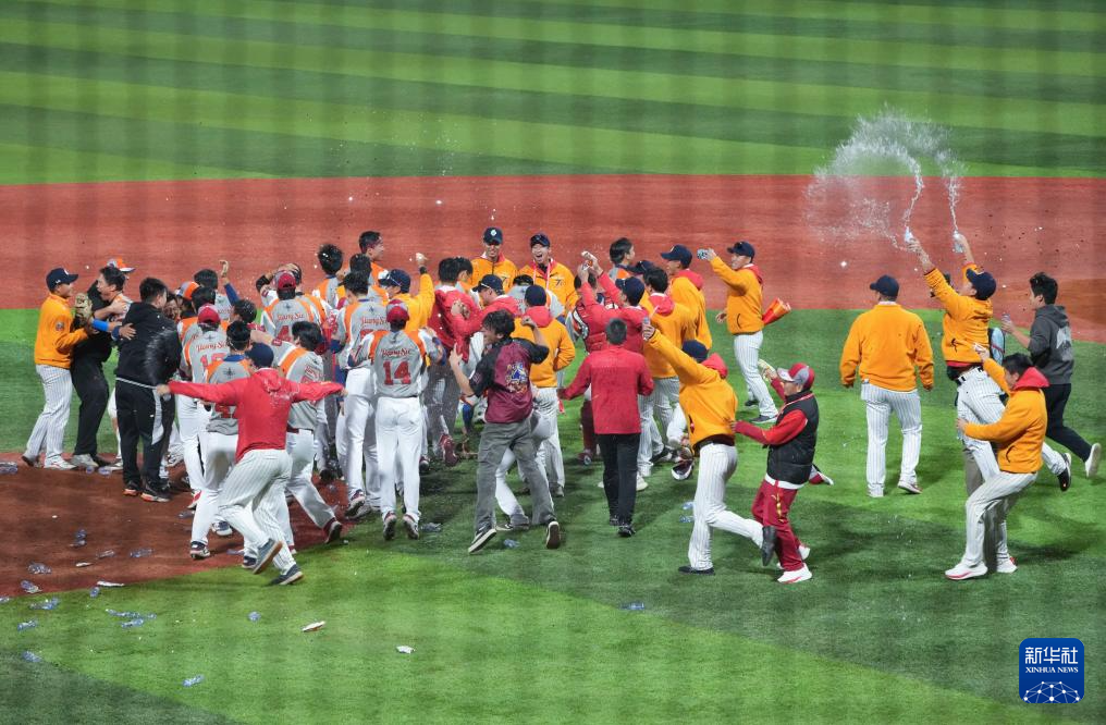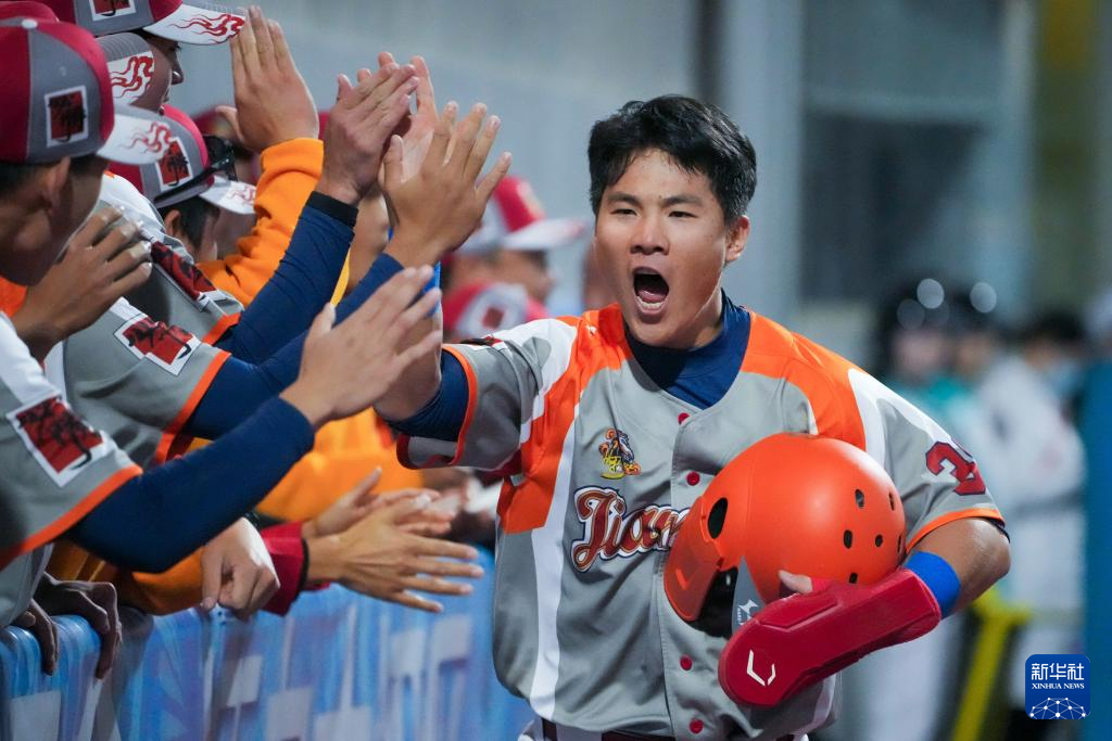 11月20日,江苏队球员庆祝队友陈晨(左一)在比赛中打出本垒打。
