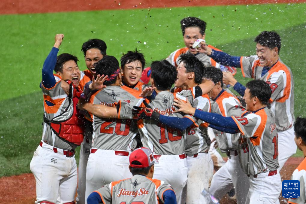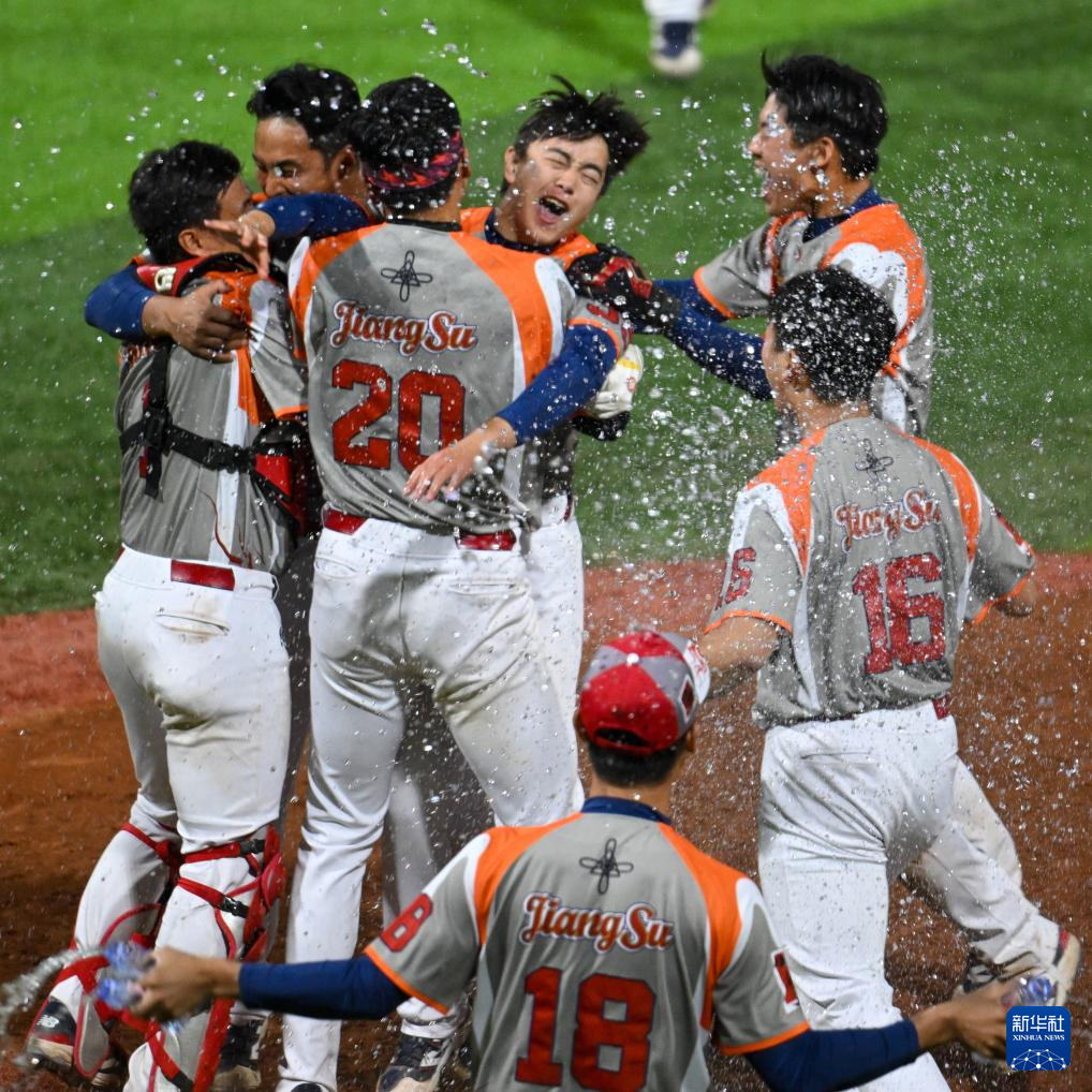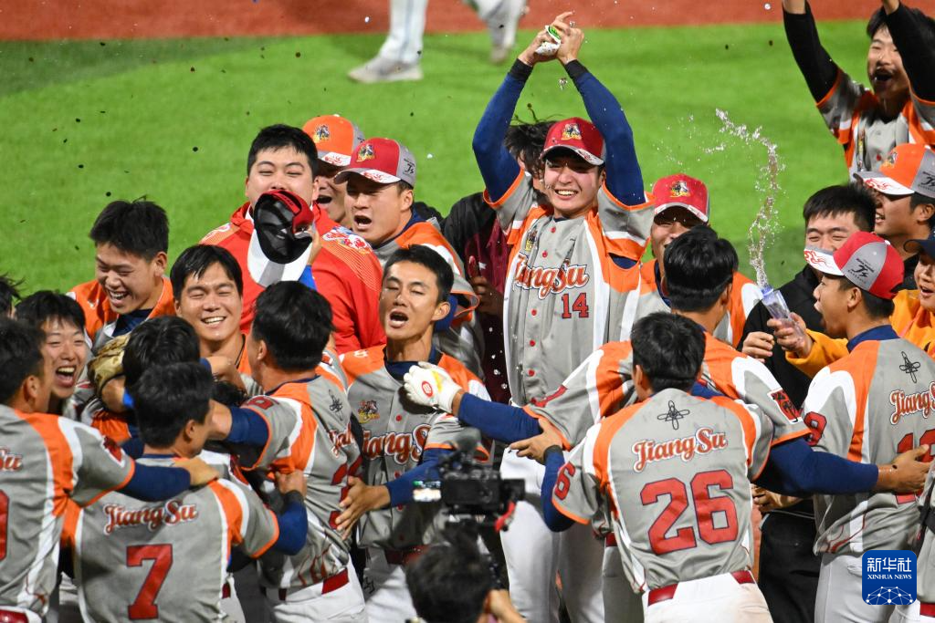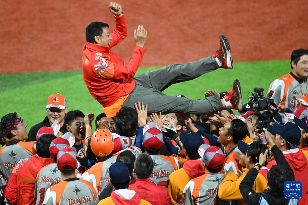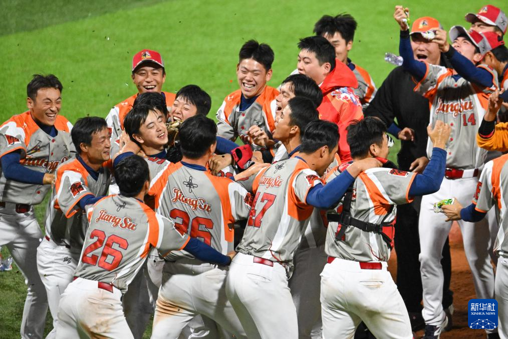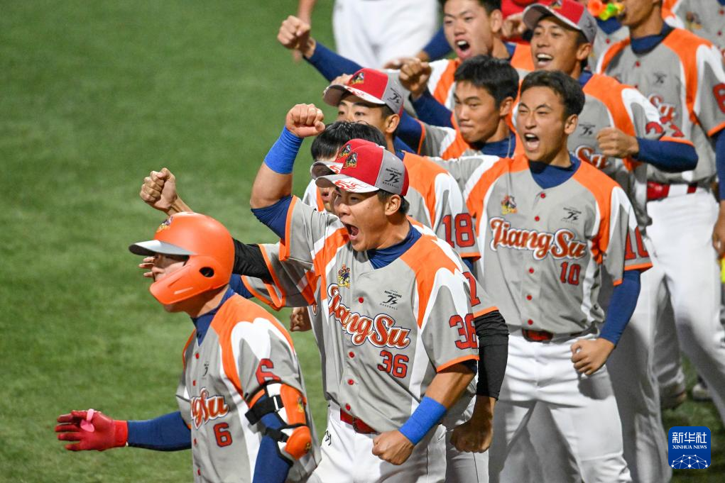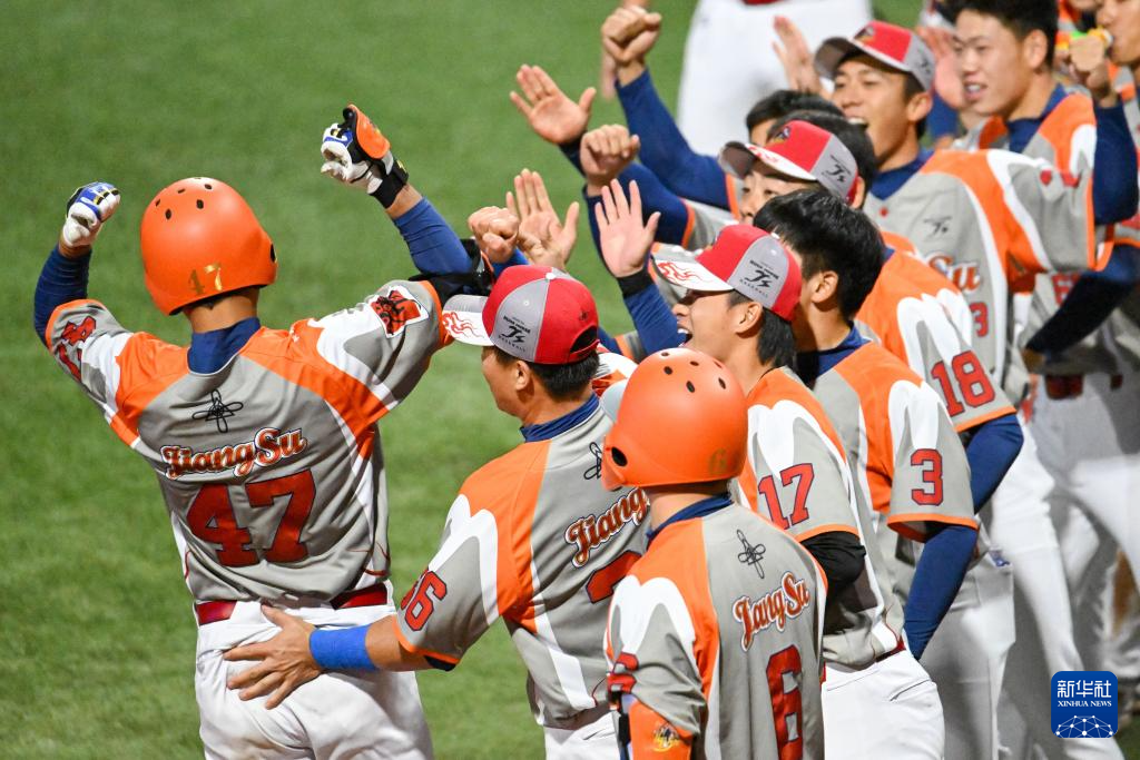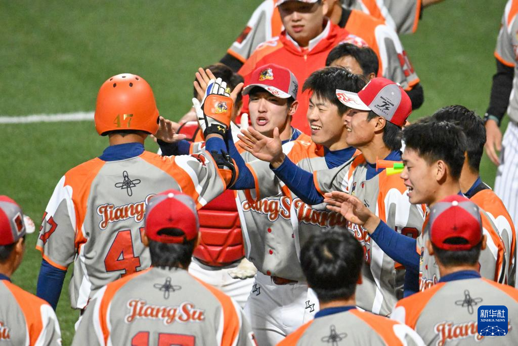 11月20日,江苏队球员庆祝队友陈晨(左二)在比赛中打出本垒打。