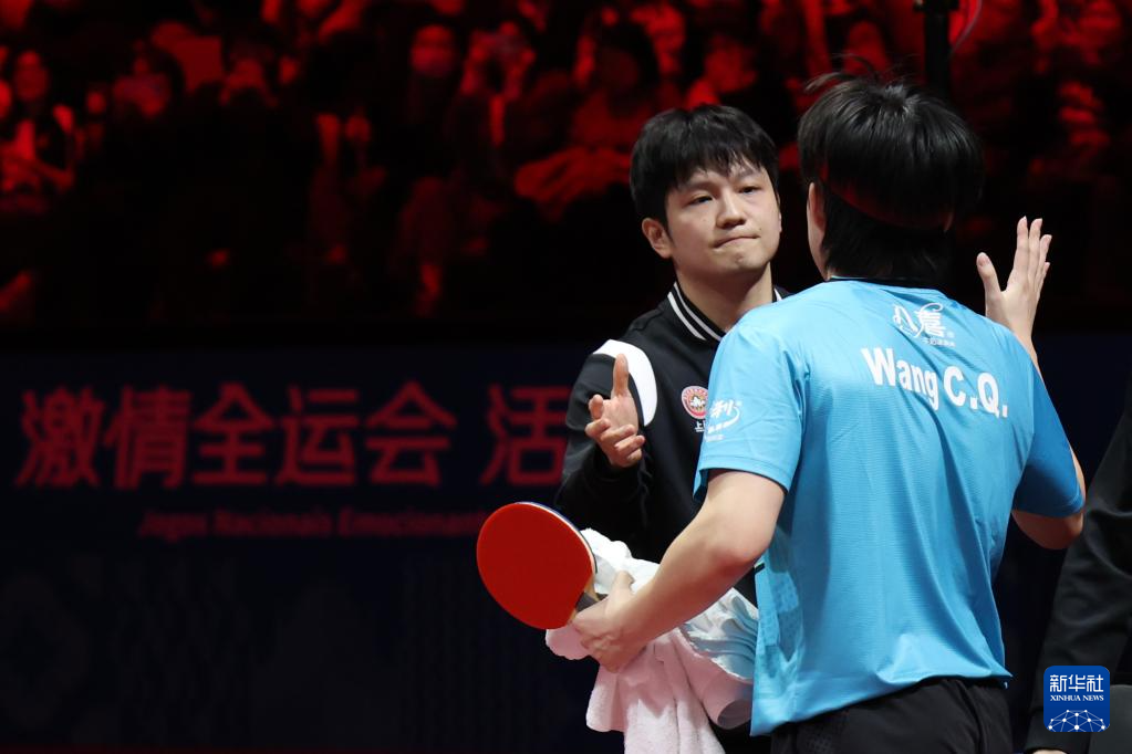 11月20日,北京队选手王楚钦(右)和上海队选手樊振东在比赛后相互致意。
