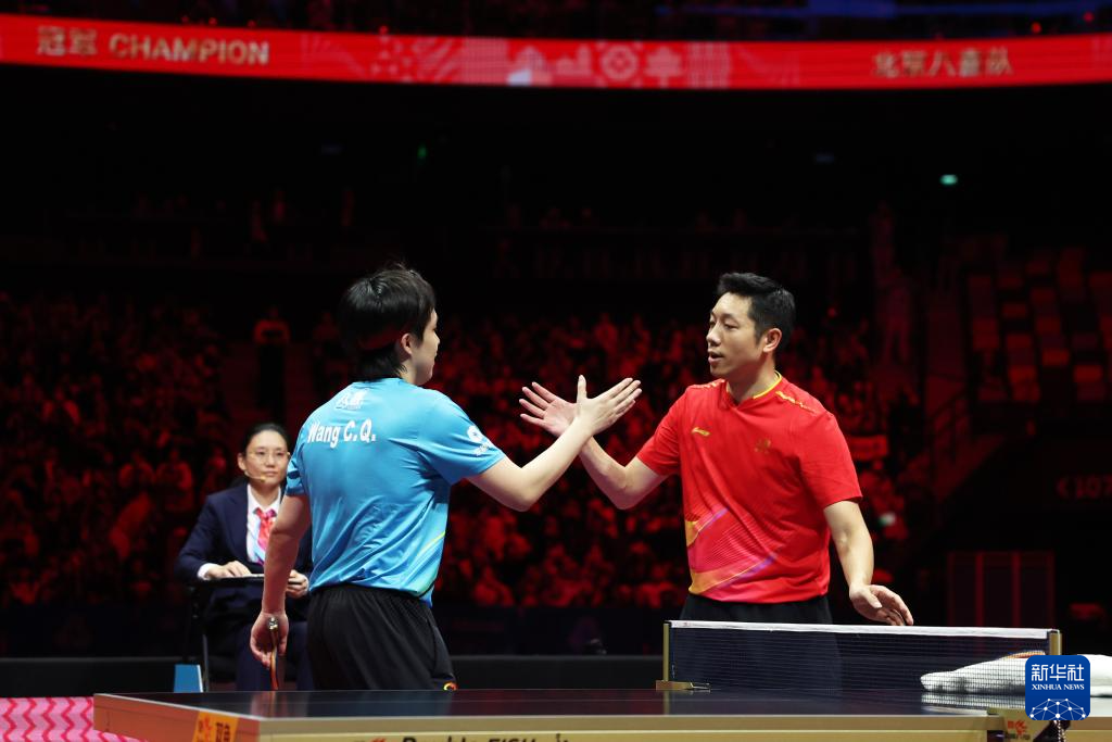 11月20日,北京队选手王楚钦(左)和上海队选手许昕(右)在男单比赛后握手致意。王楚钦3比0战胜许昕。