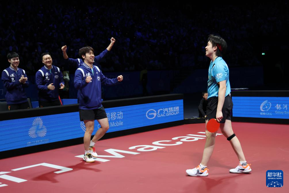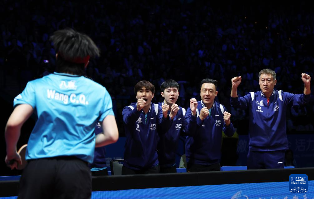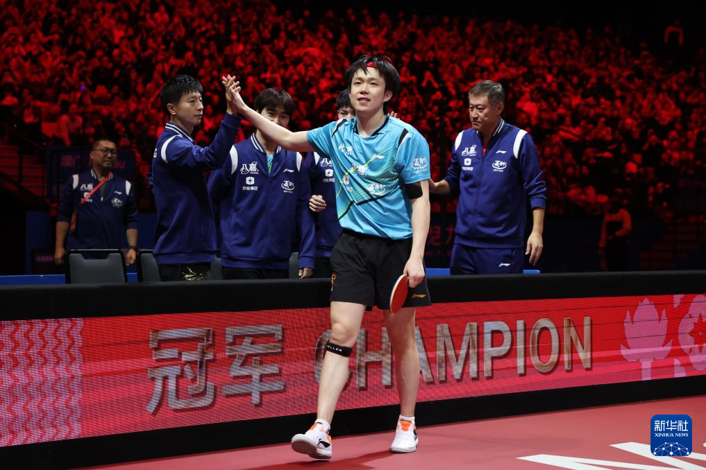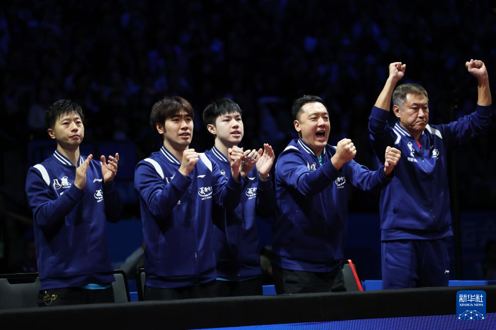 11月20日,北京队选手王楚钦(左三)在赢得男单比赛后与队友马龙(左一)击掌庆祝。王楚钦3比0战胜许昕。