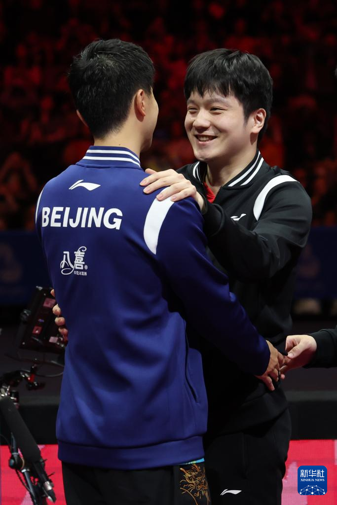 11月20日,北京队选手王楚钦(左)和上海队选手樊振东在比赛后拥抱。