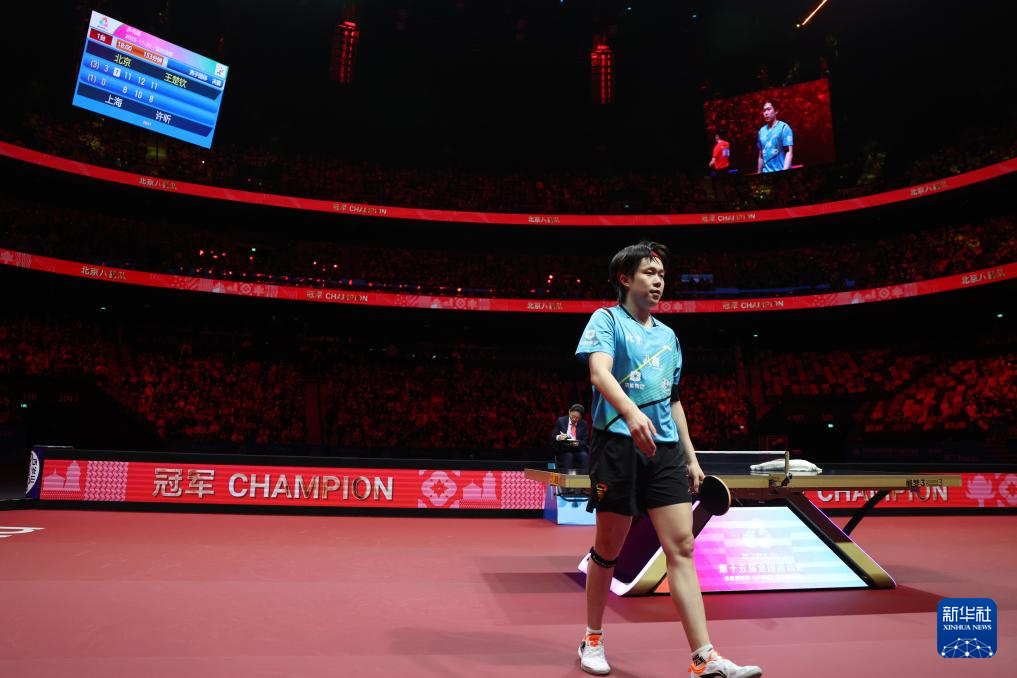 11月20日,北京队选手王楚钦在赢得男单比赛后。他3比0战胜上海队选手许昕。