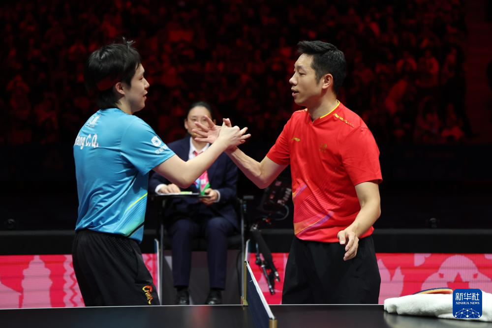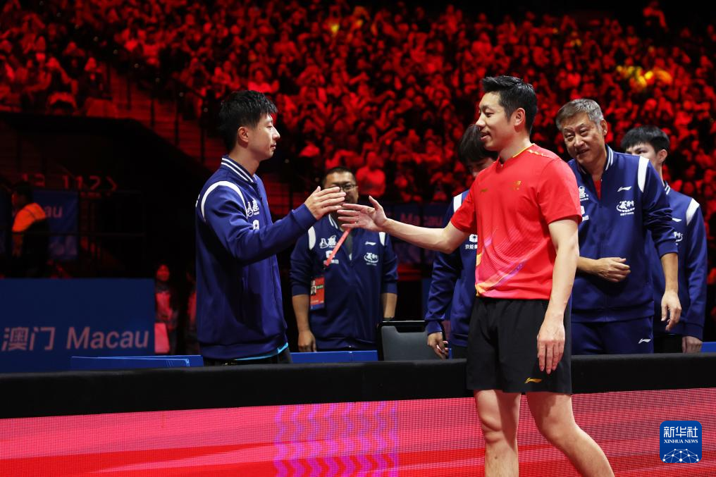 11月20日,北京队选手马龙(左)和上海队选手樊振东在比赛后相互致意。