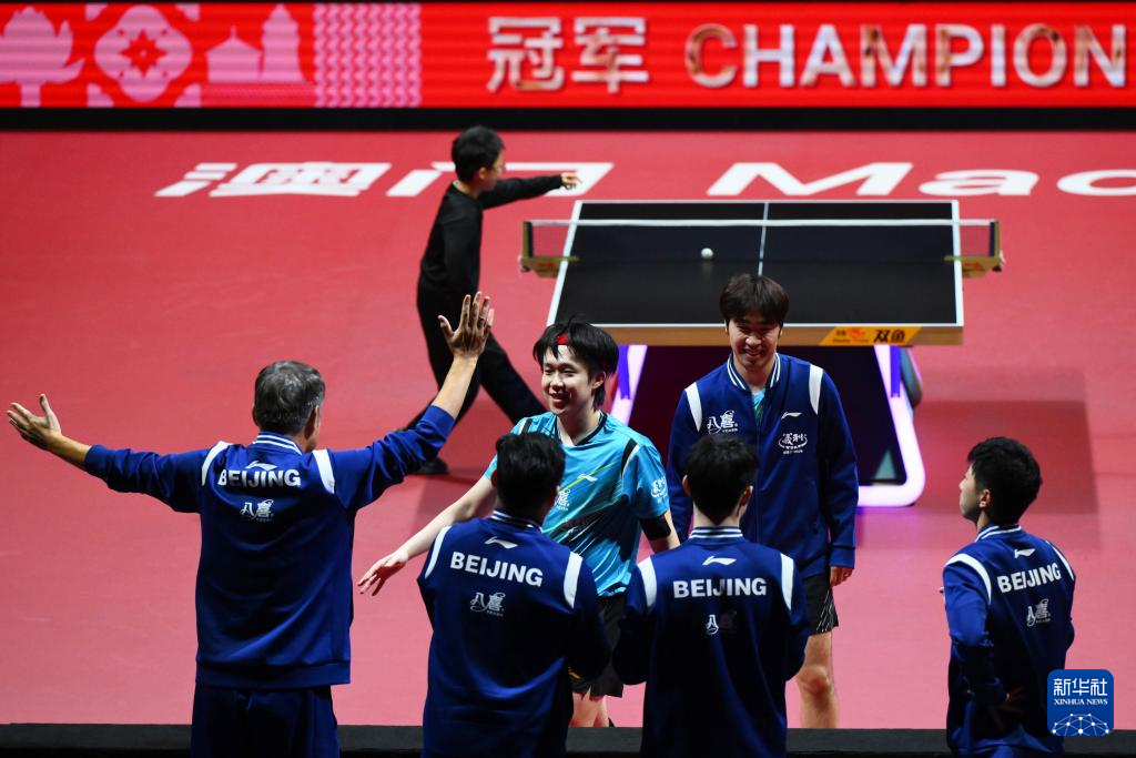 11月20日,北京队选手王楚钦(中)与队友庆祝夺冠。