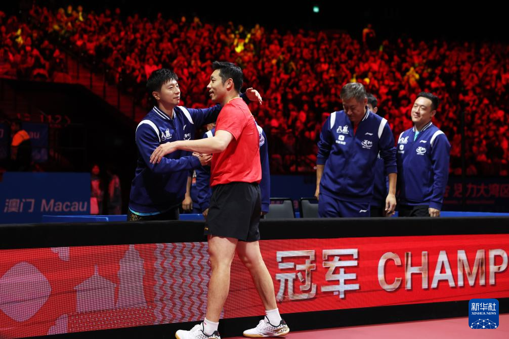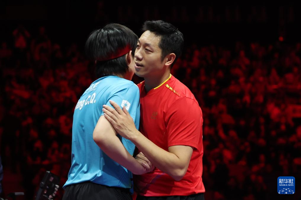 11月20日,北京队选手马龙(左)和上海队选手樊振东在赛后拥抱致意。