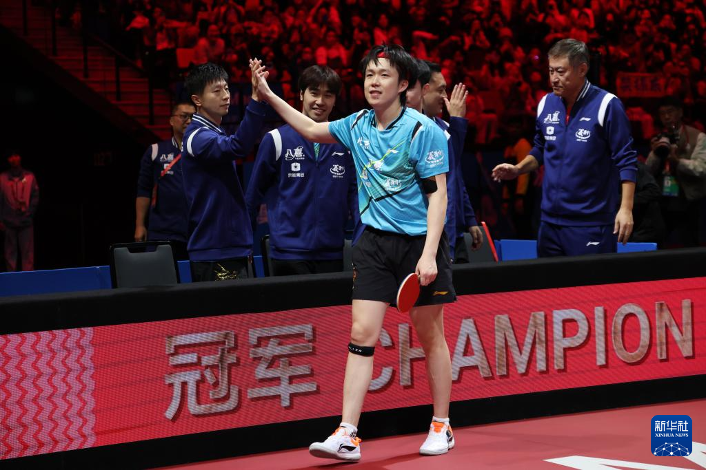 11月20日,北京队选手王楚钦(右二)在赢得男单比赛后与队友马龙(左二)击掌庆祝。王楚钦3比0战胜许昕。