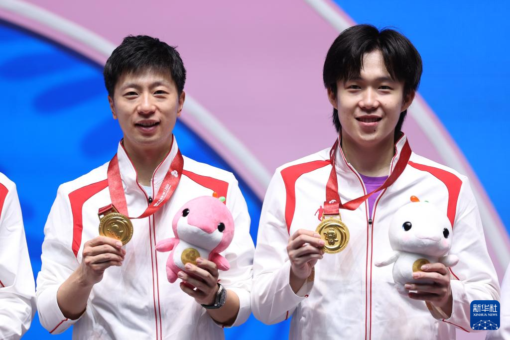 11月20日,冠军北京队成员马龙(左)、王楚钦在颁奖仪式上。