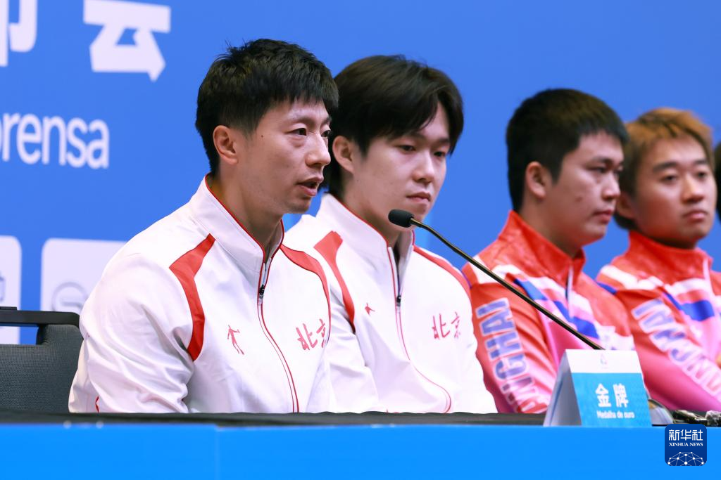11月20日,北京队选手马龙(左一)在赛后发布会上发言。