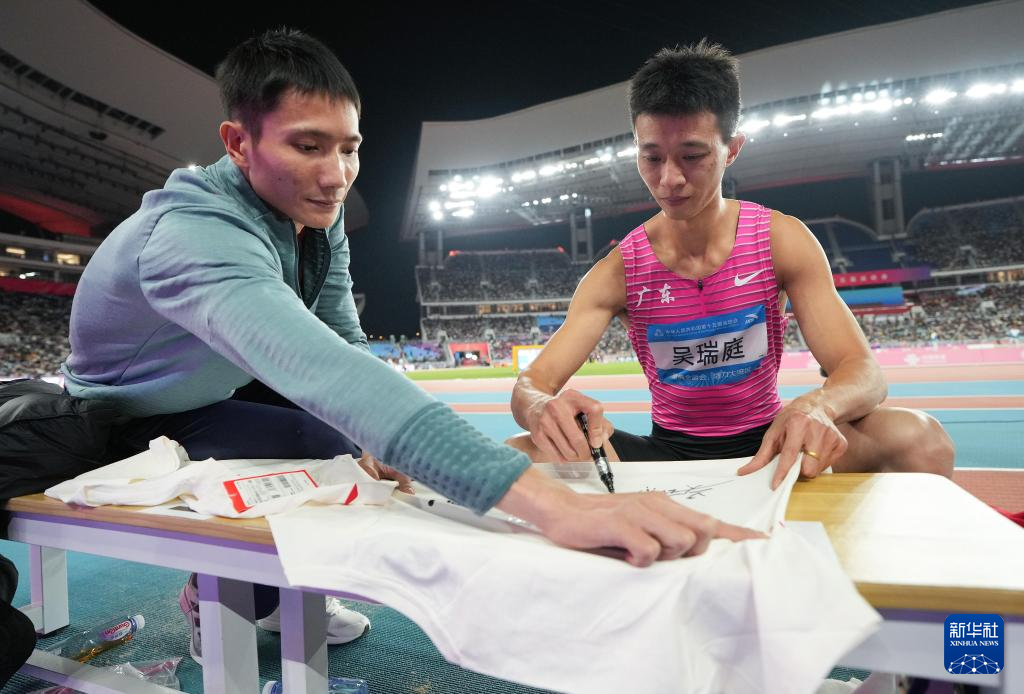 11月20日,广东队选手吴瑞庭(右)在比赛后签名。他获得冠军。