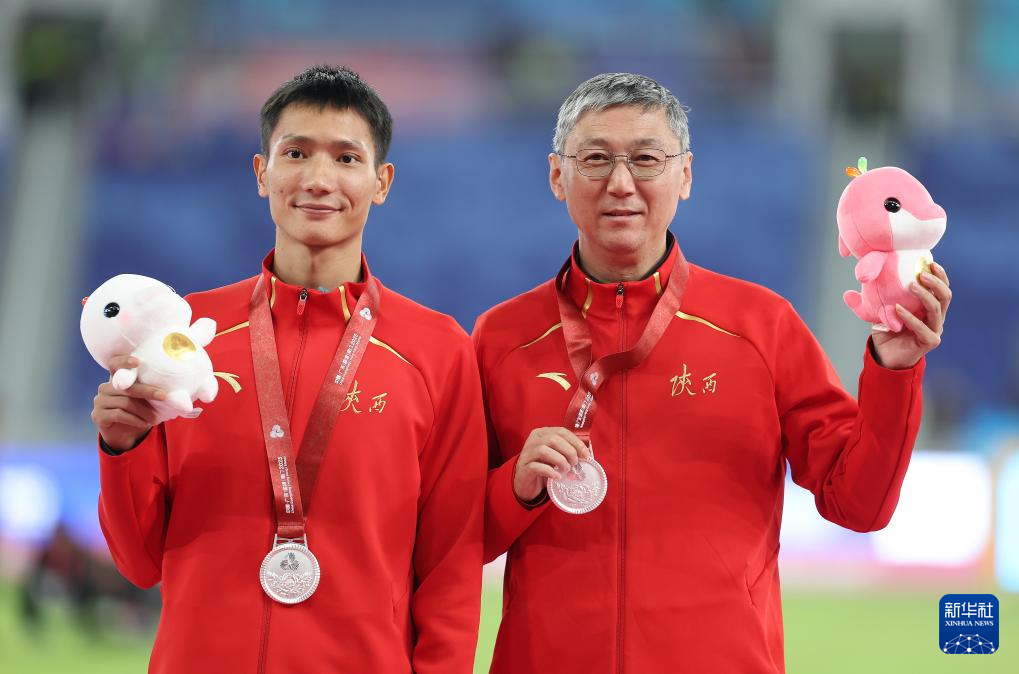 11月20日,获得亚军的陕西队选手方耀庆在颁奖仪式上与教练合影。