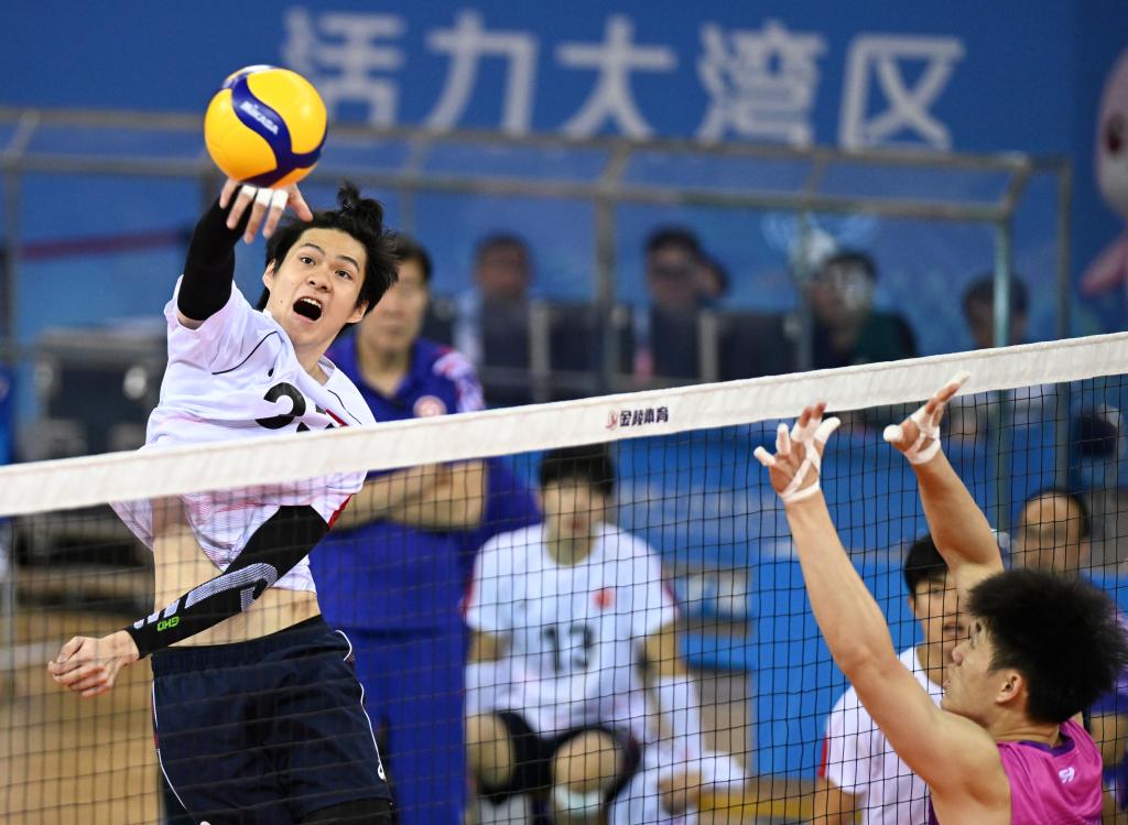 11月11日,香港队球员黄卓楠(左)在比赛中扣球。新华社记者 陈钟昊 摄