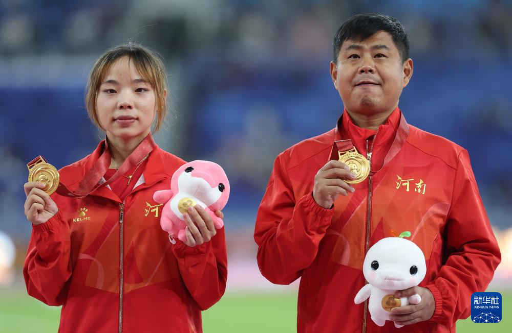 11月20日,获得冠军的河南队选手梁田田(左)与教练在颁奖仪式上合影。