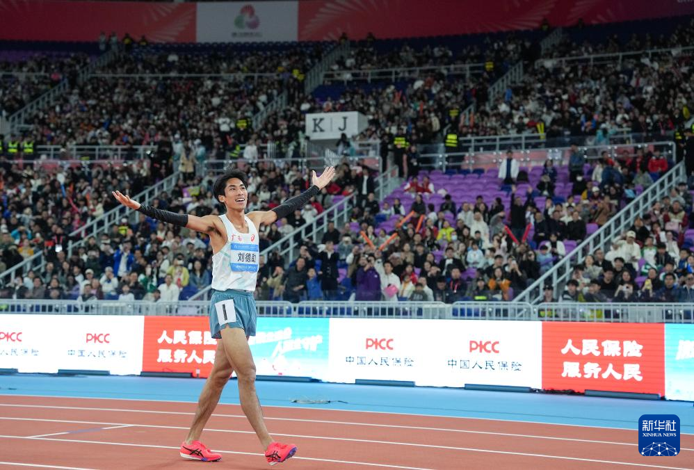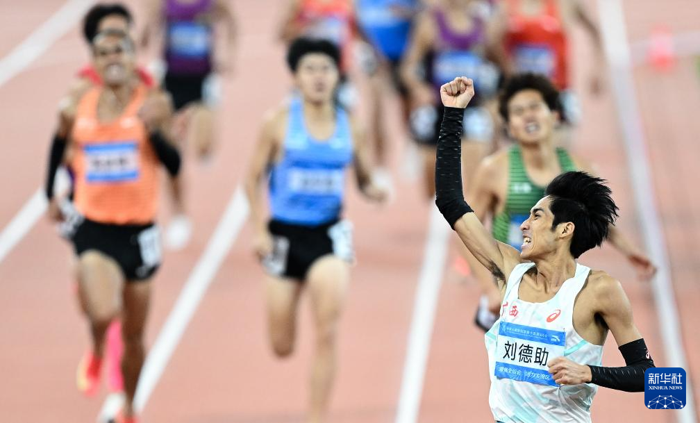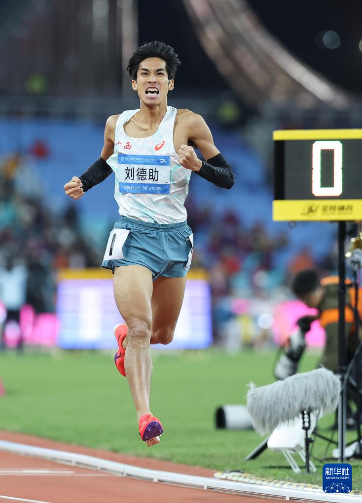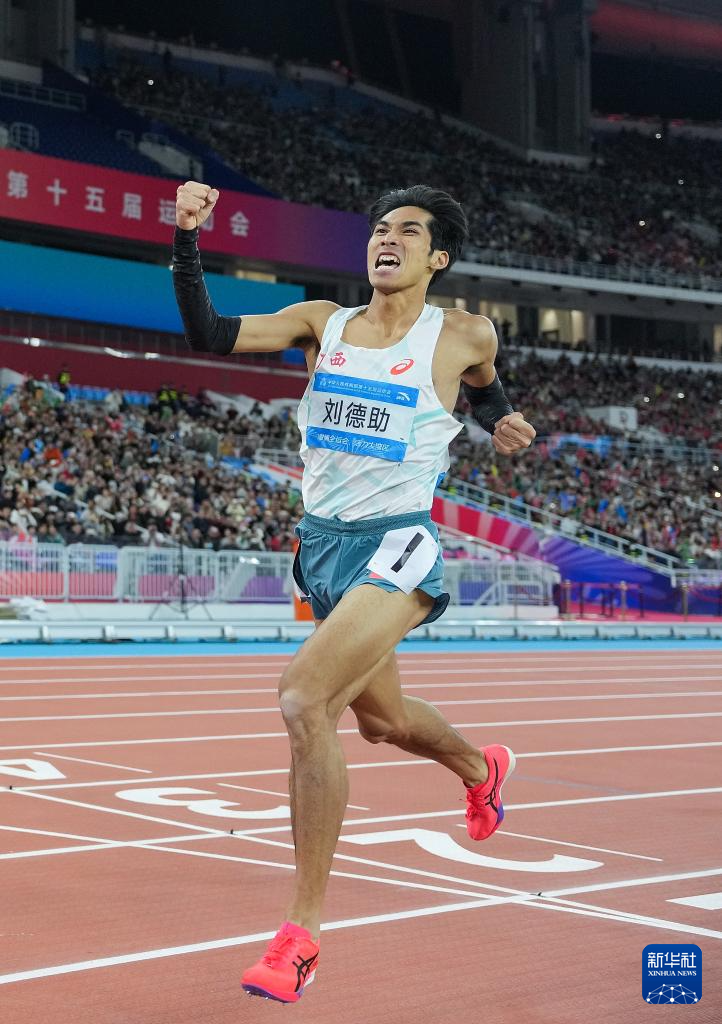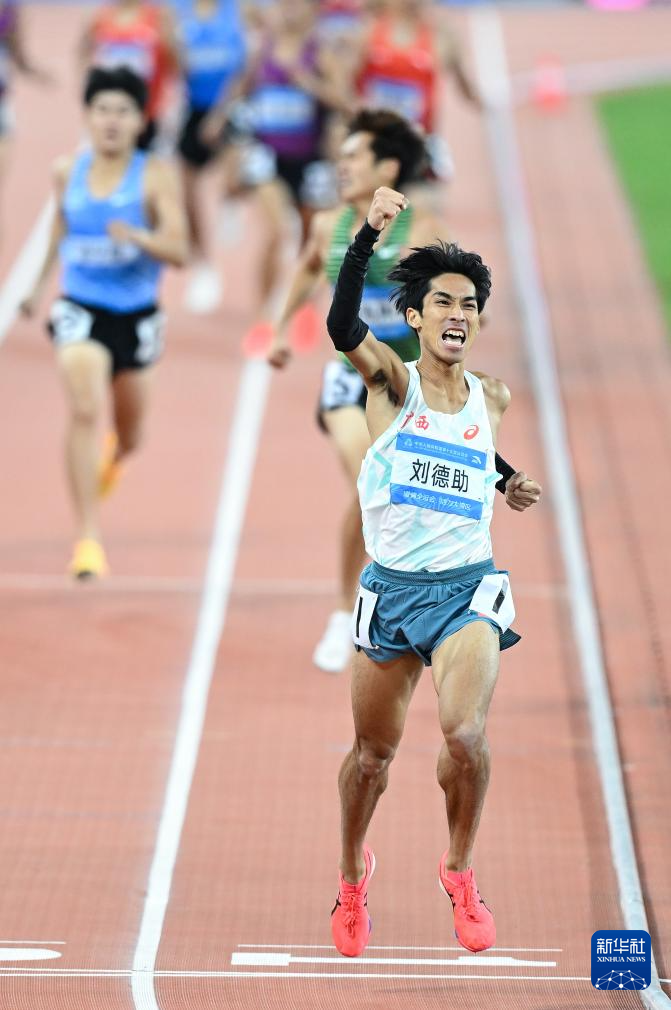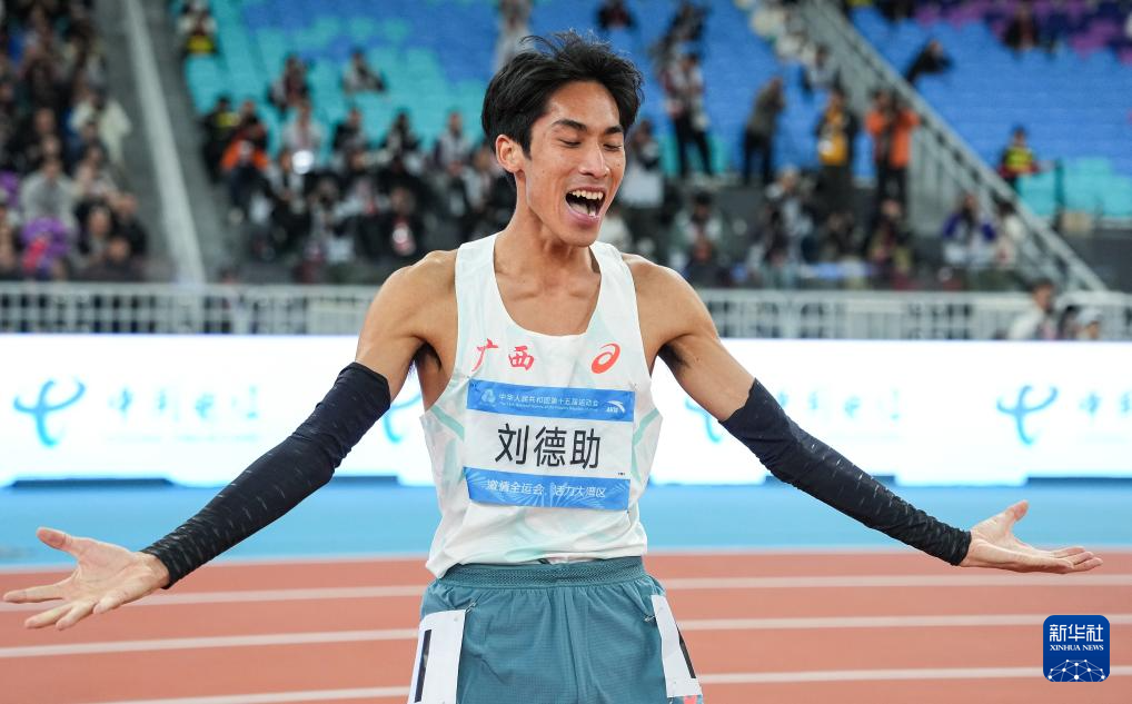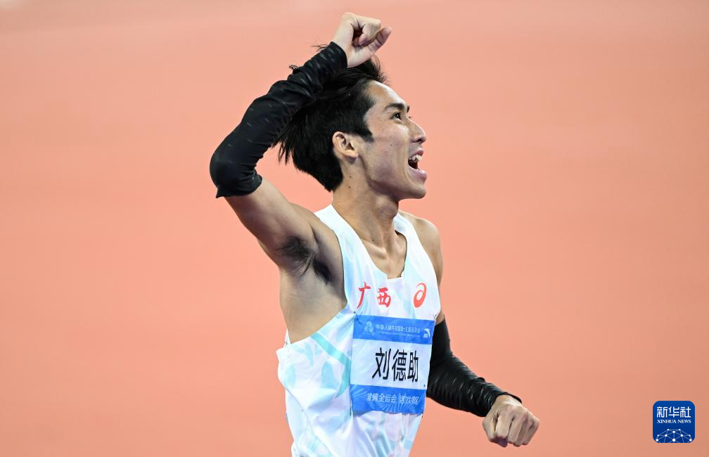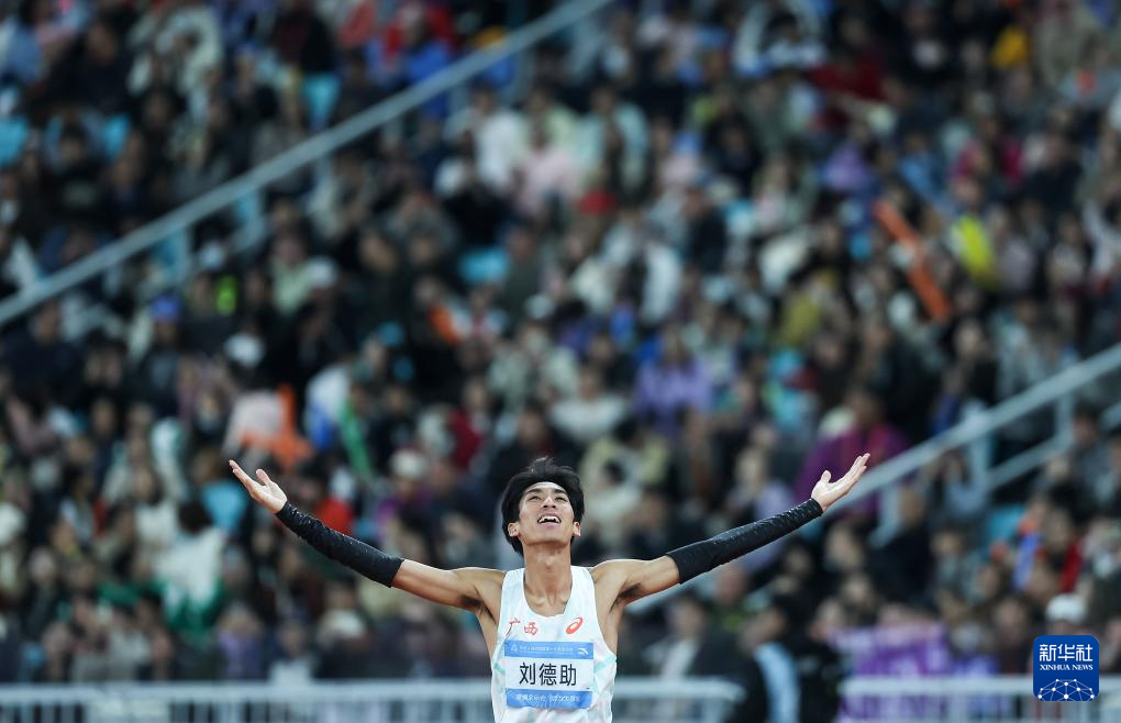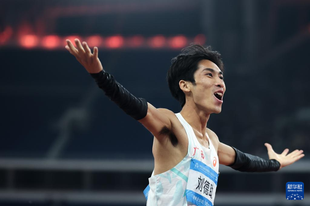 11月20日,广西队选手刘德助在冲线后庆祝夺冠。