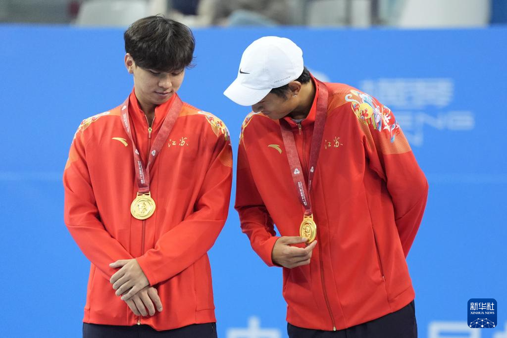 11月19日,亚军浙江队组合布云朝克特(左)/郑展在男子双打颁奖仪式上。