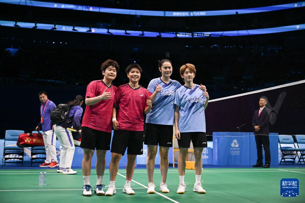 11月20日,福建队组合黄东萍(左二)/谭宁(左一)与四川队组合郑雨(右二)/张殊贤在赛后合影。