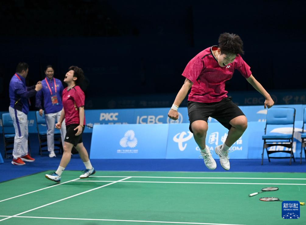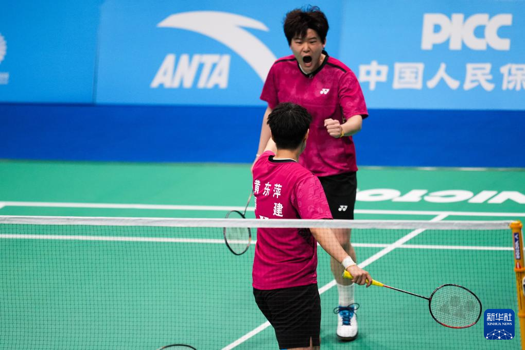 11月20日,福建队组合黄东萍(右)/谭宁庆祝比赛胜利。
