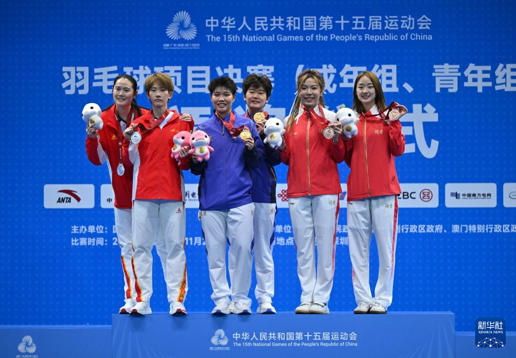 11月20日,冠军福建队组合黄东萍(左三)/谭宁(右三)、亚军四川队组合郑雨(左一)/张殊贤(左二)和季军湖南队组合贾一凡(右二)/张驰在颁奖仪式上。