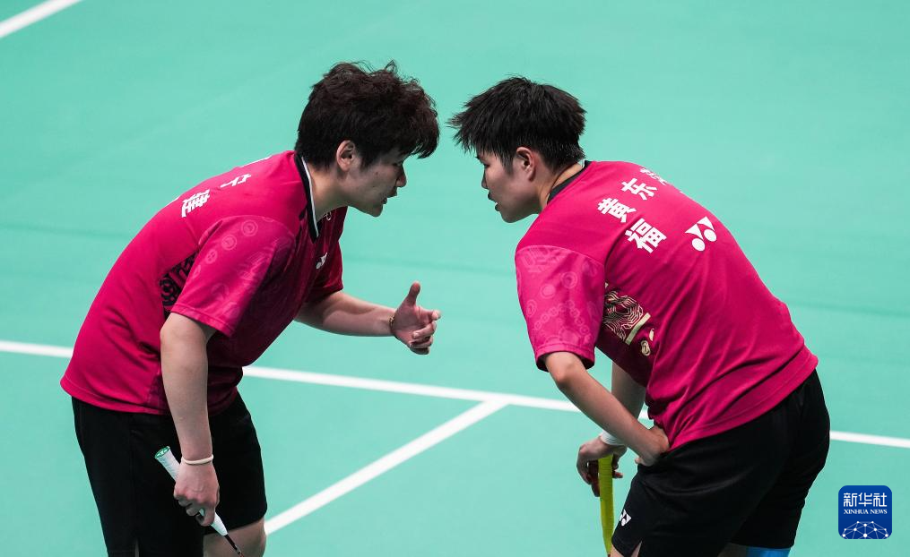 11月20日,福建队组合黄东萍(右)/谭宁在比赛中商量战术。