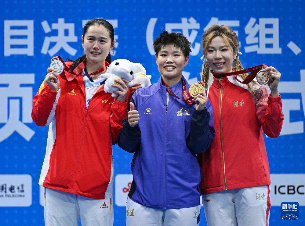 11月20日,冠军福建队选手黄东萍(中)、亚军四川队选手郑雨(左)和季军湖南队选手贾一凡在颁奖仪式上。