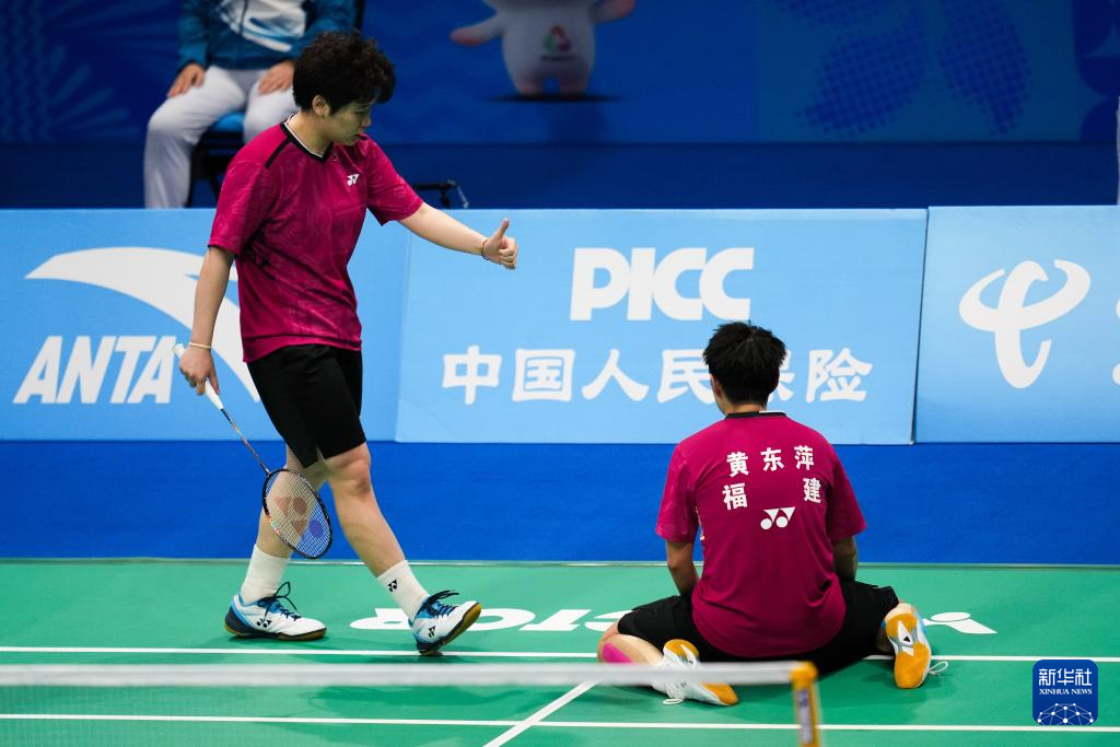 11月20日,福建队选手谭宁(左)在比赛中鼓励搭档黄东萍。
